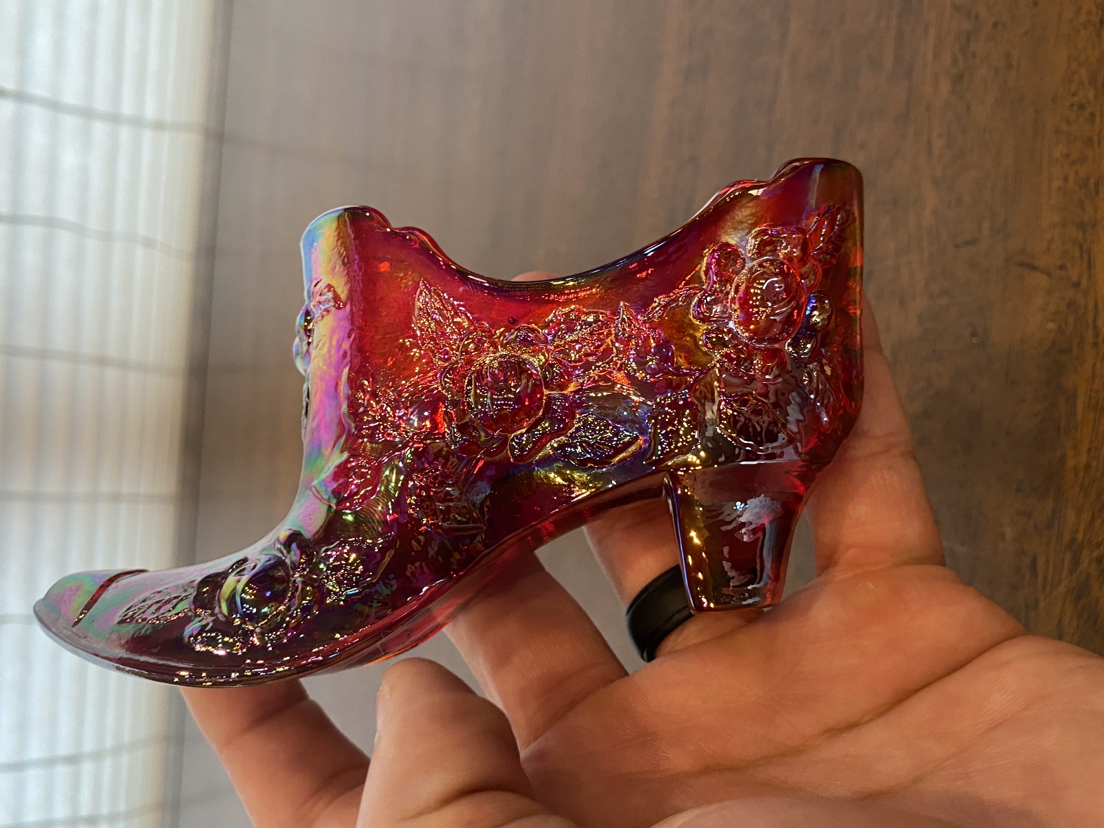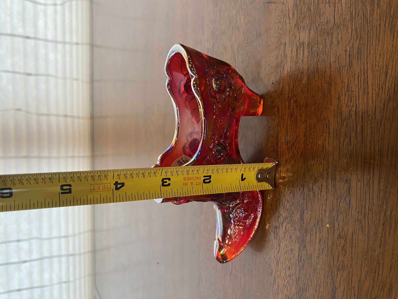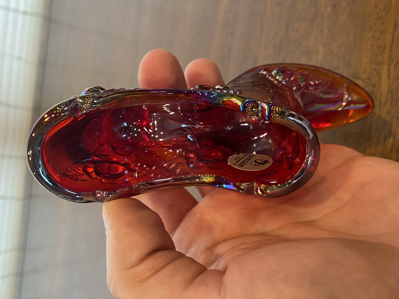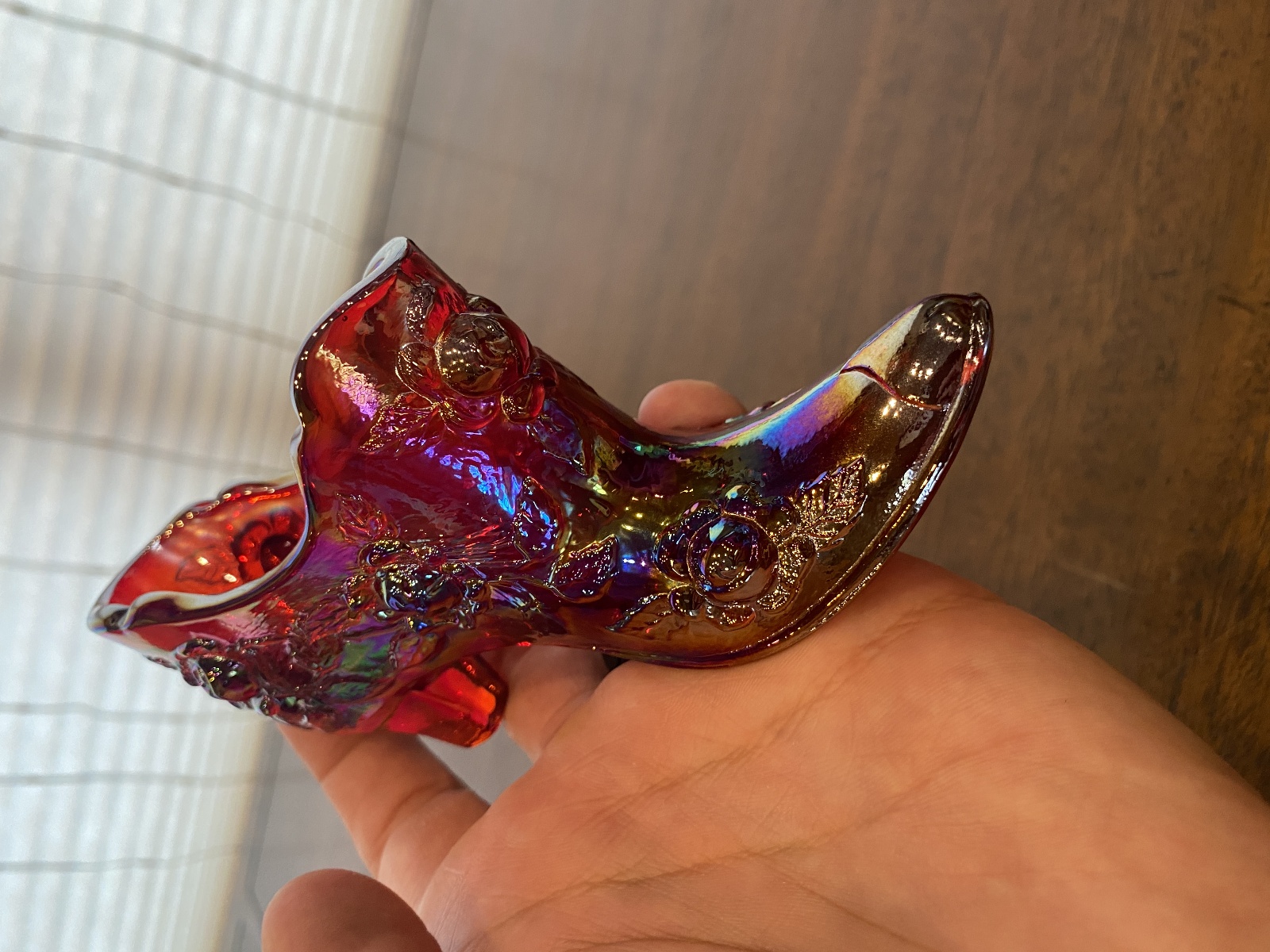 VTG FENTON Red Iridescent Cabbage Rose Glass Shoe/Slipper Figurine W/LABEL 5.5"L