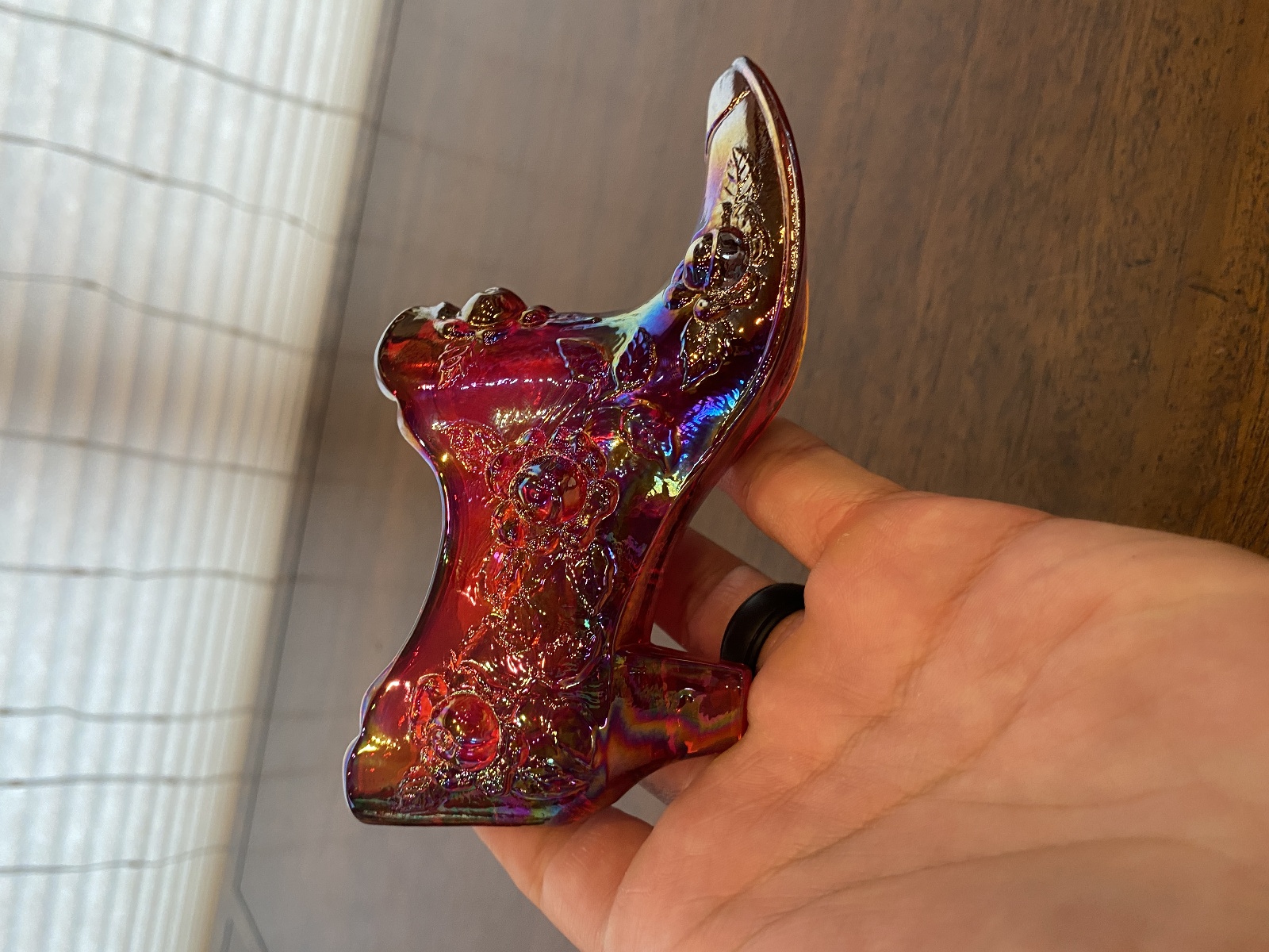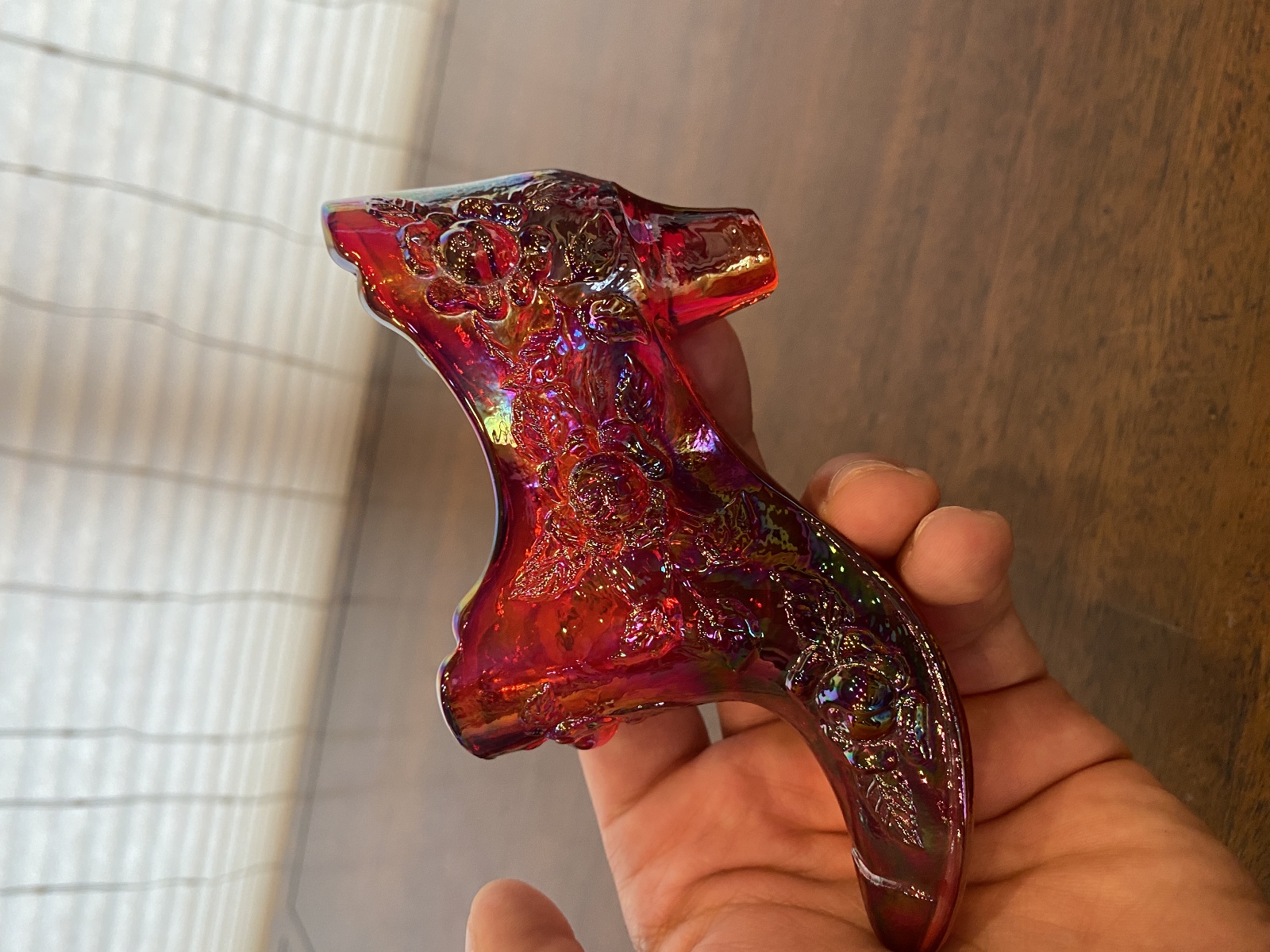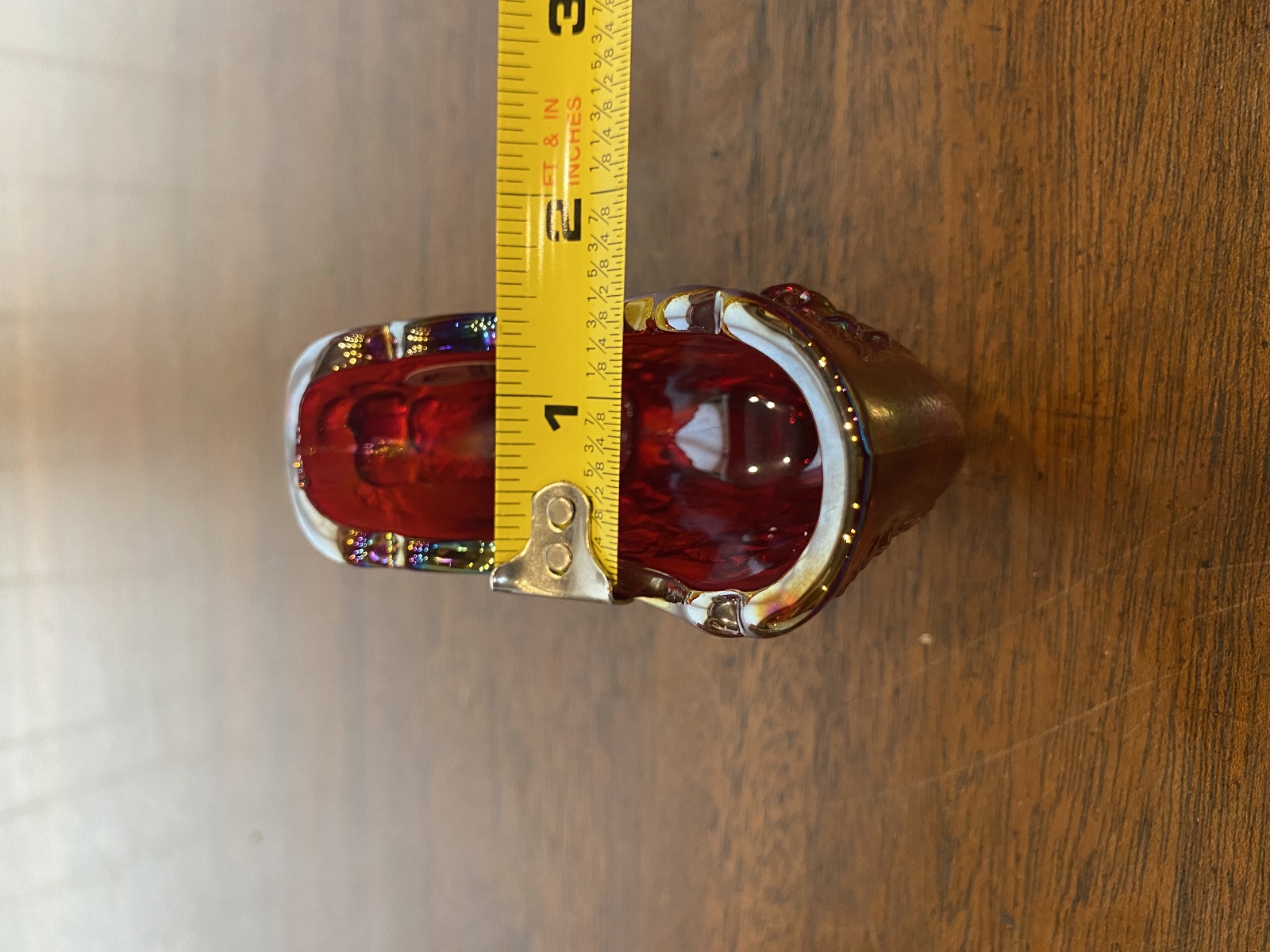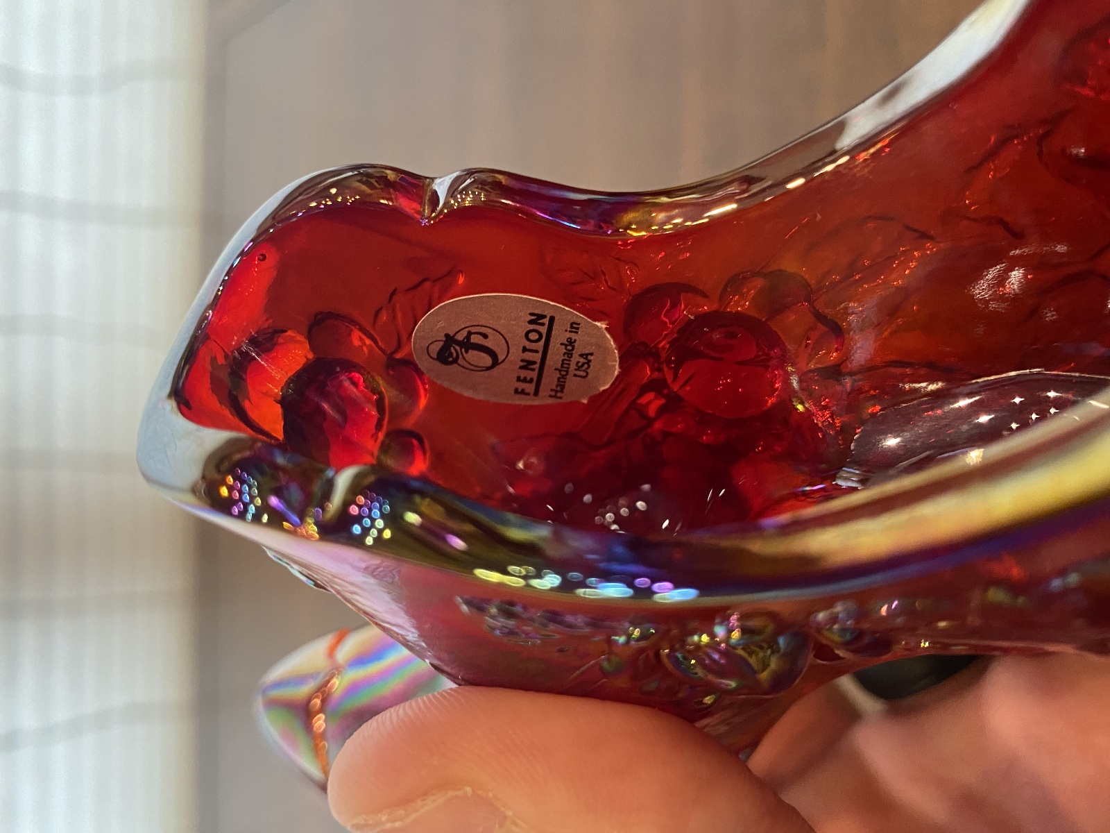 VTG FENTON Red Iridescent Cabbage Rose Glass Shoe/Slipper Figurine W/LABEL 5.5"L
