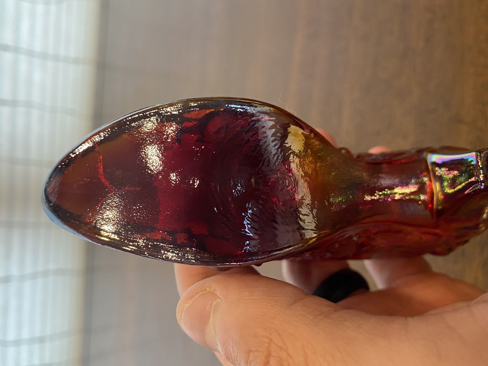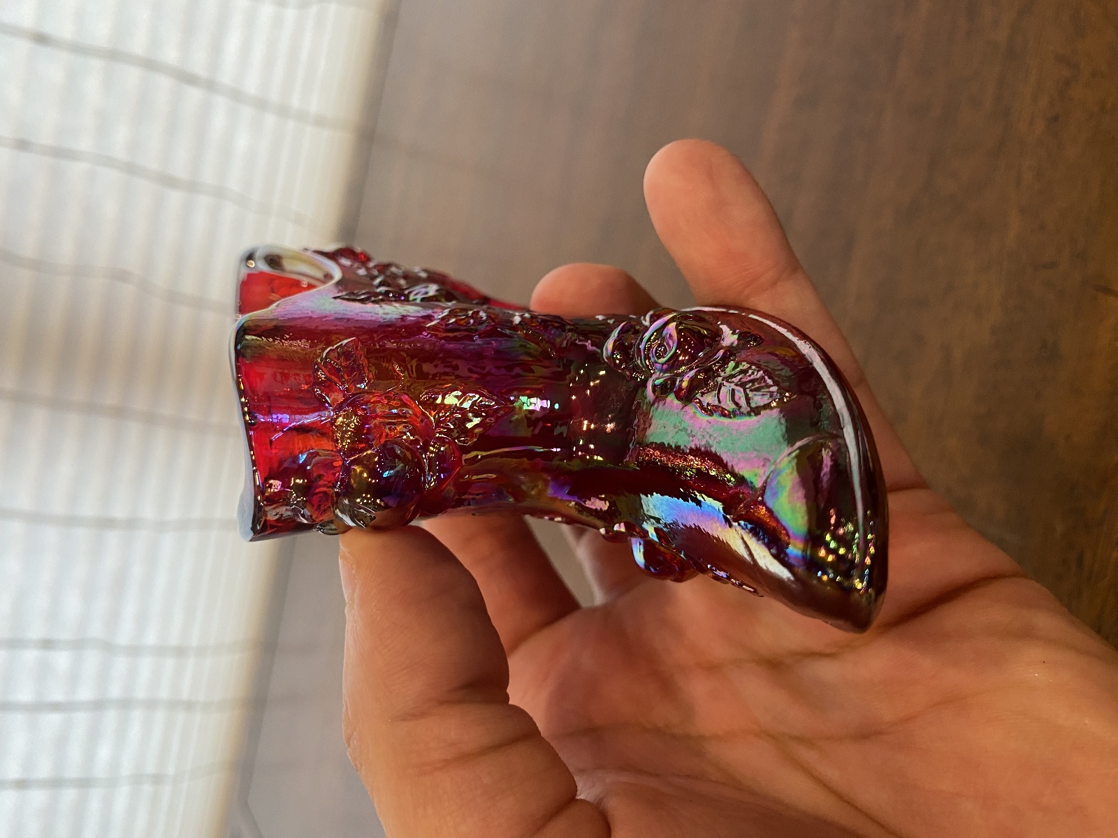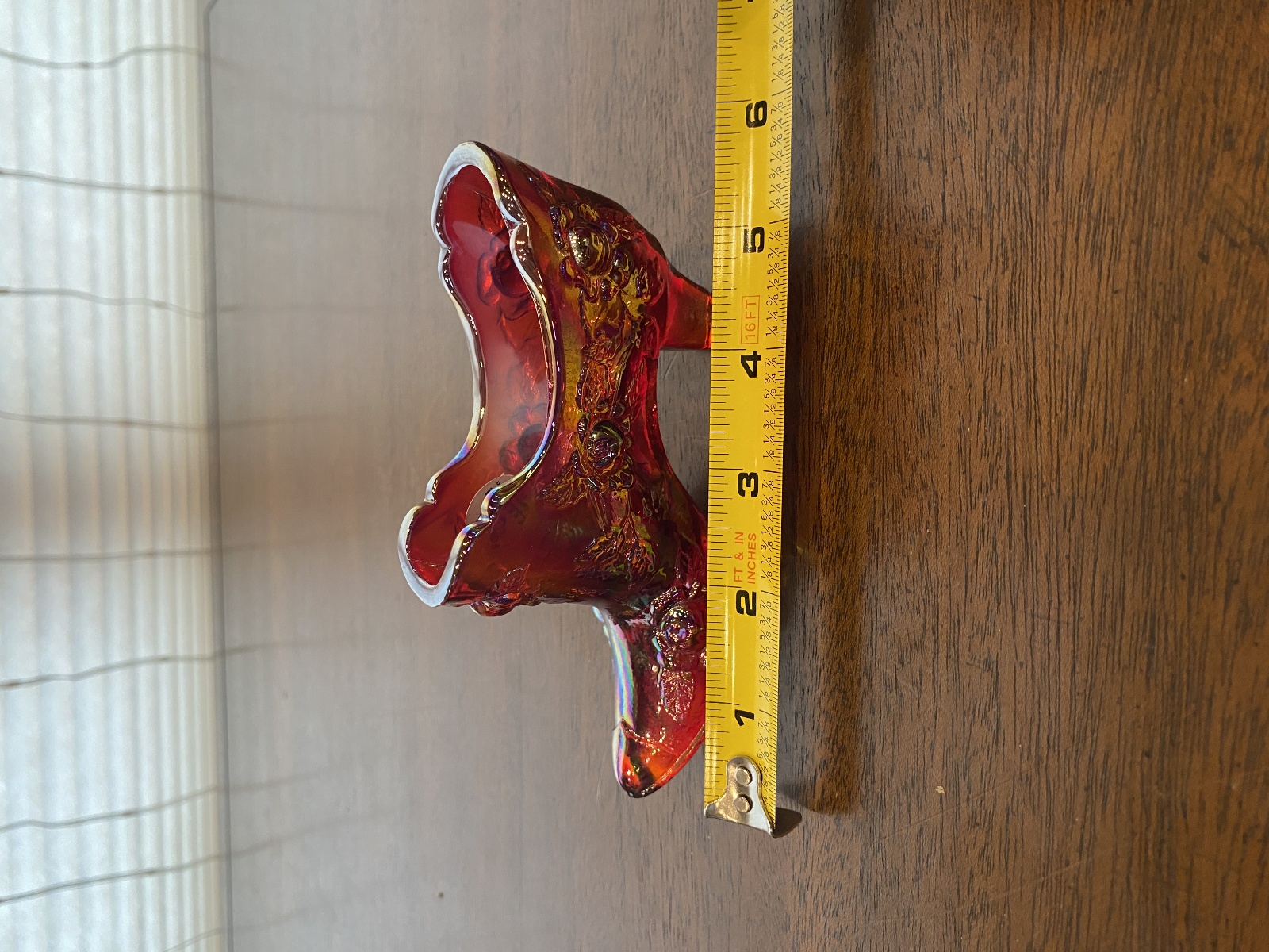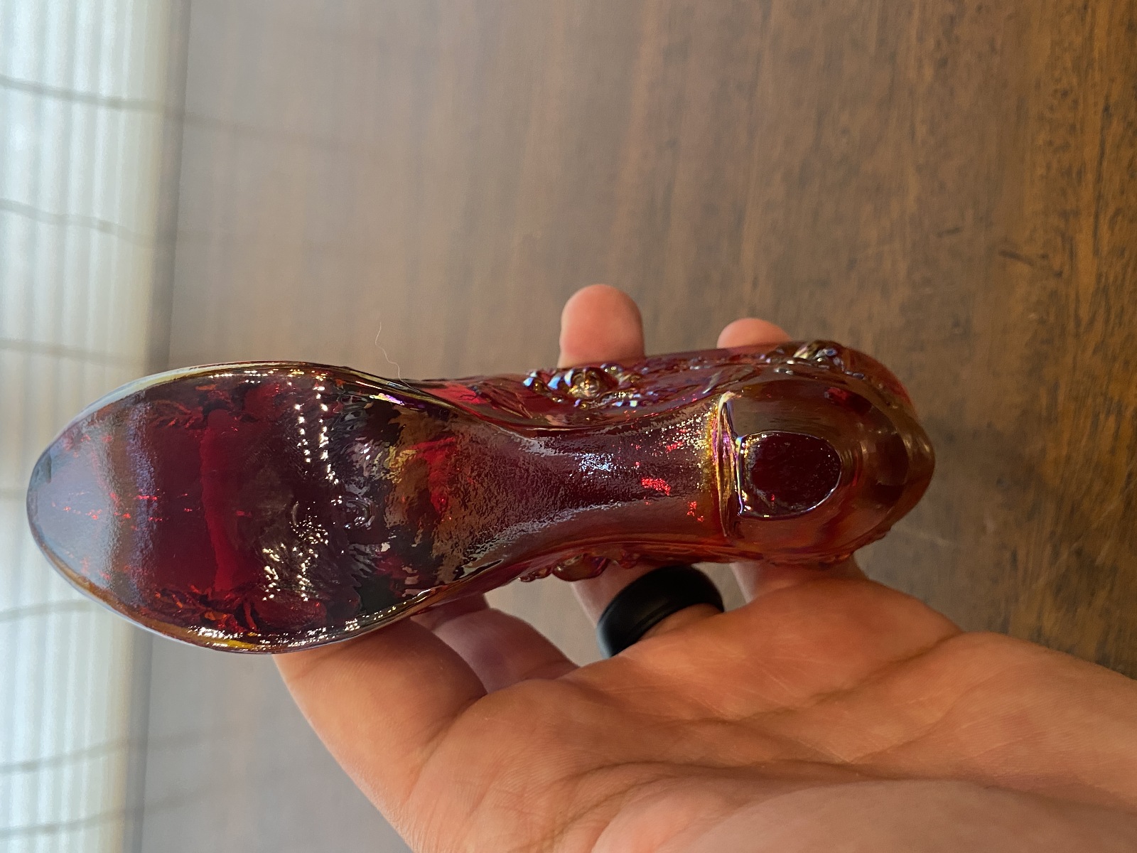 VTG FENTON Red Iridescent Cabbage Rose Glass Shoe/Slipper Figurine W/LABEL 5.5"L