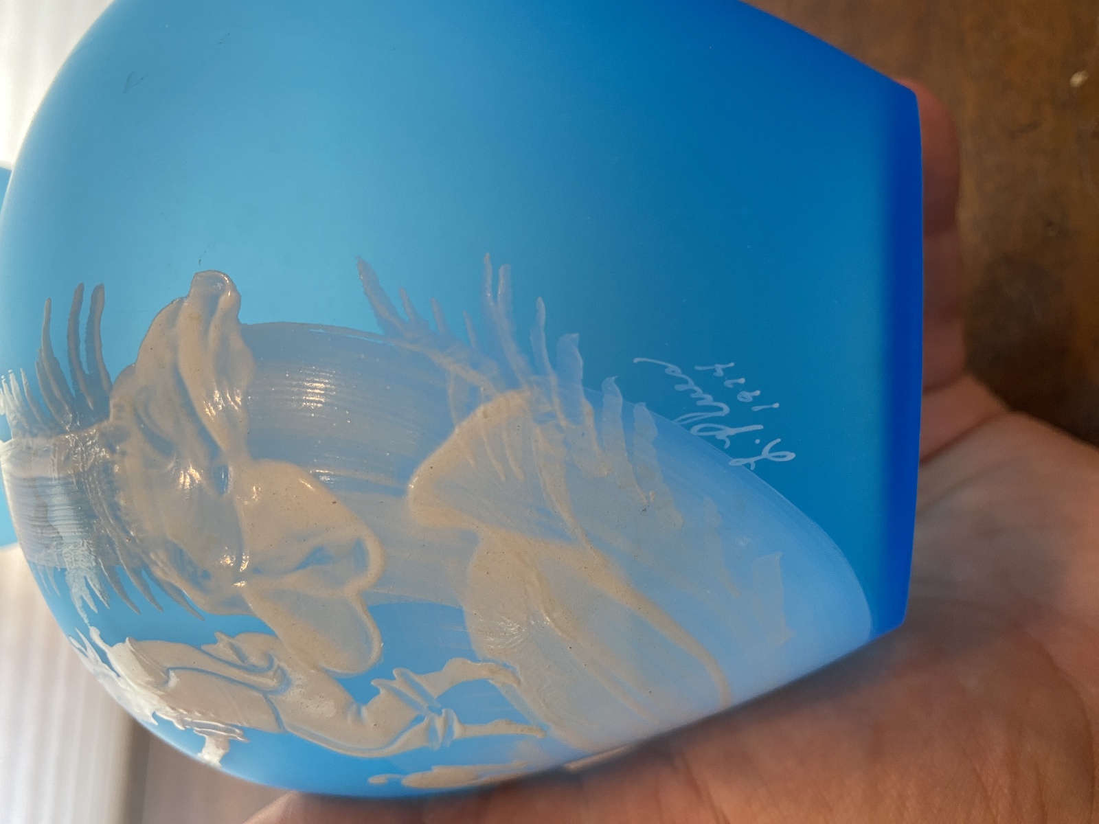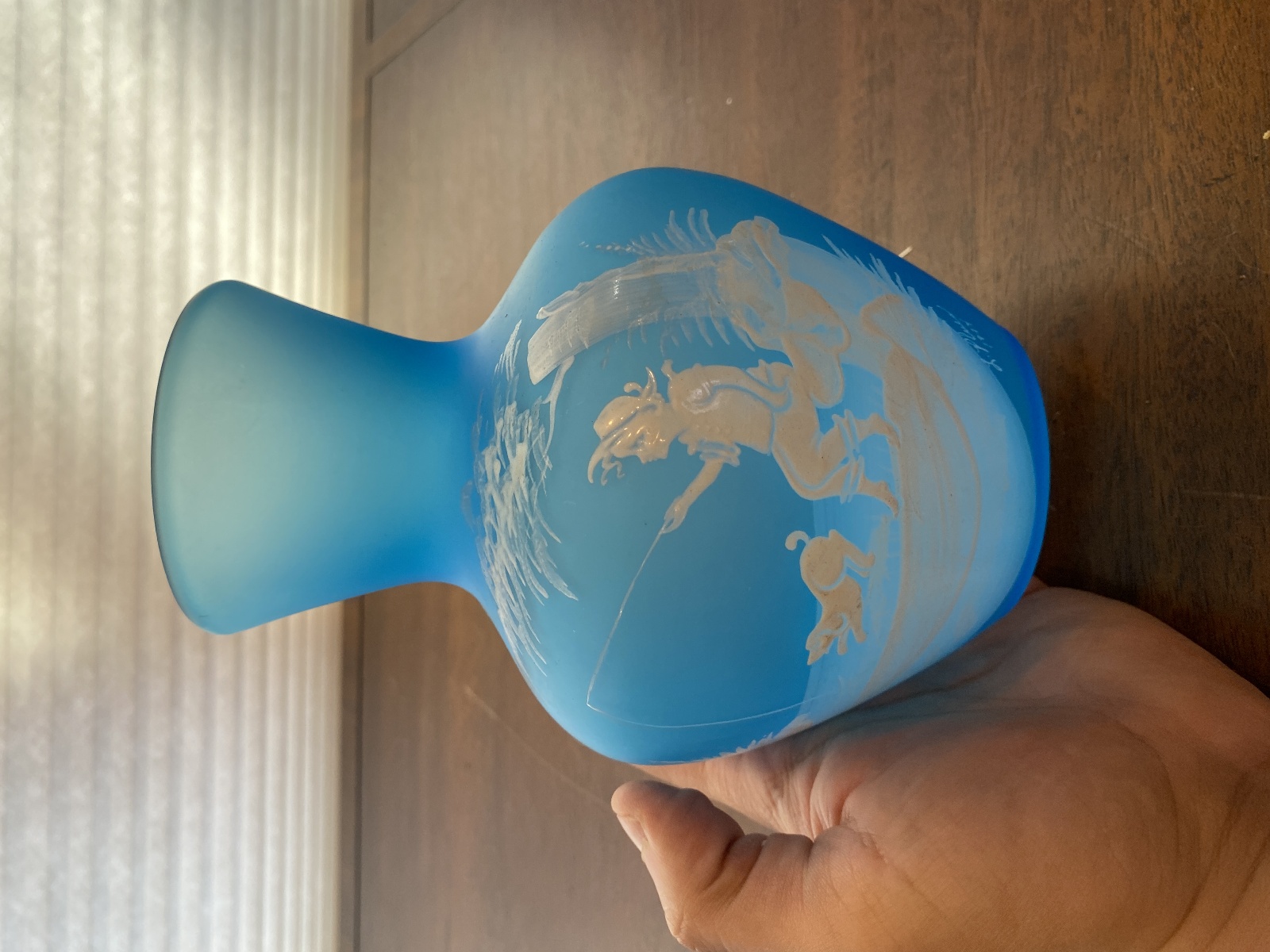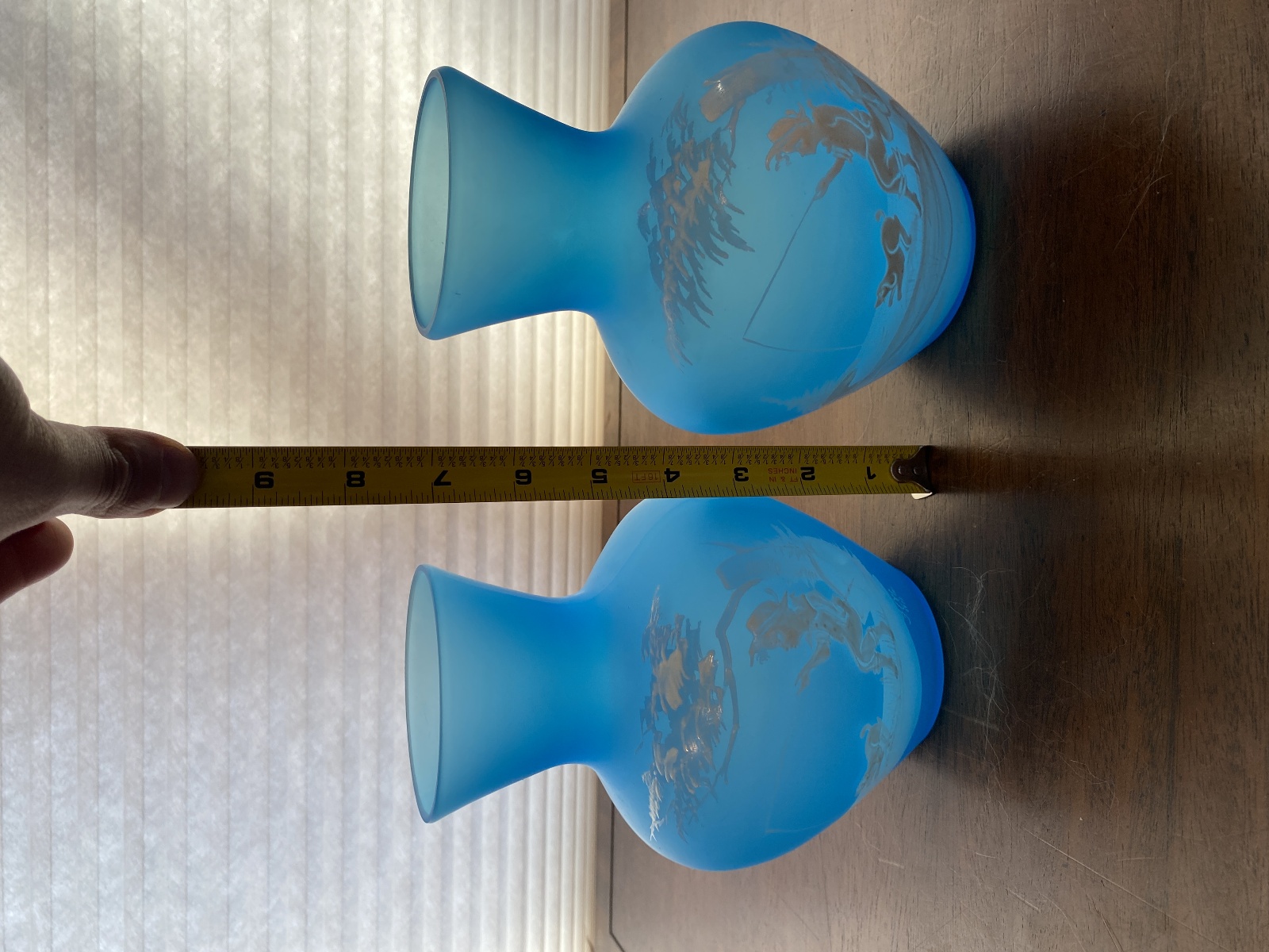 PAIR Of VTG Blue MARY GREGORY Westmoreland Child Fishing Vases SIGNED 7"H