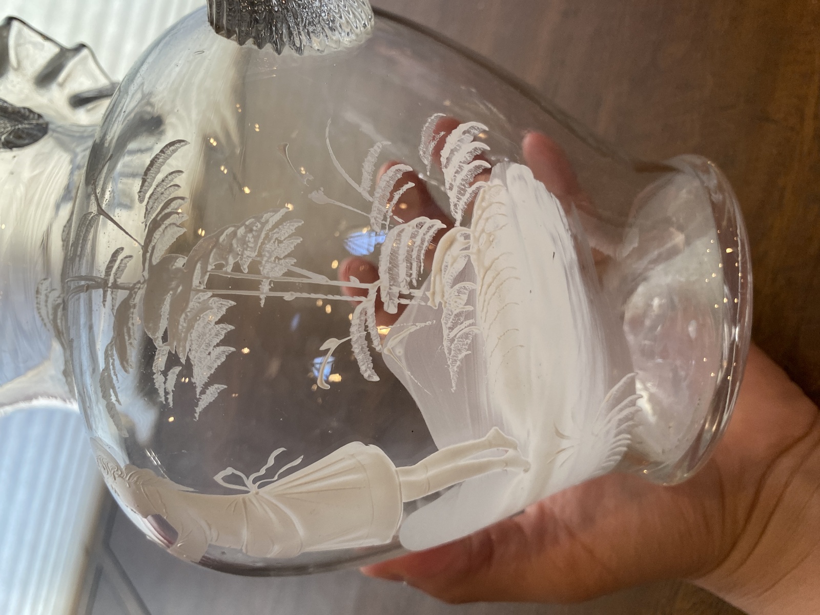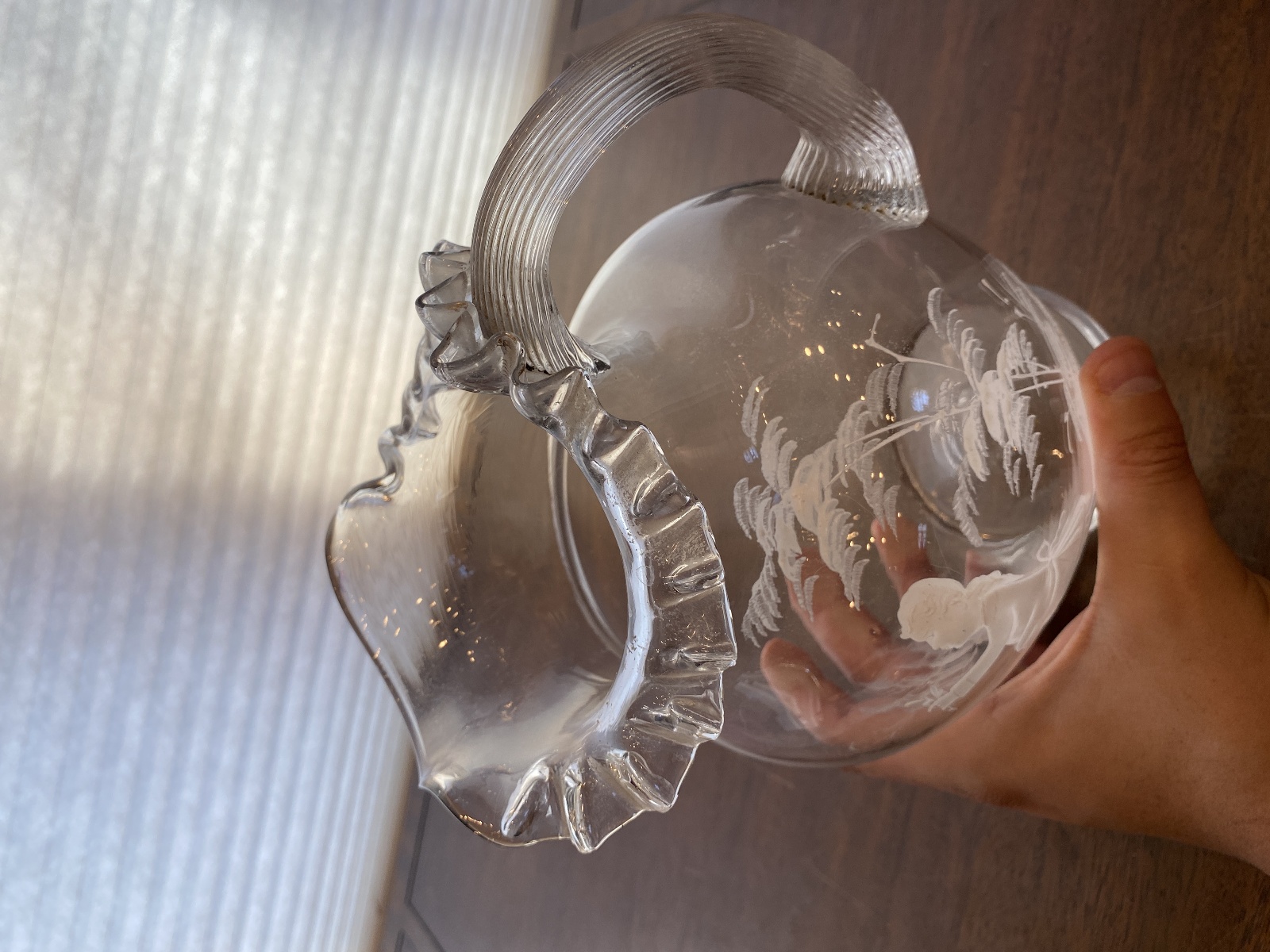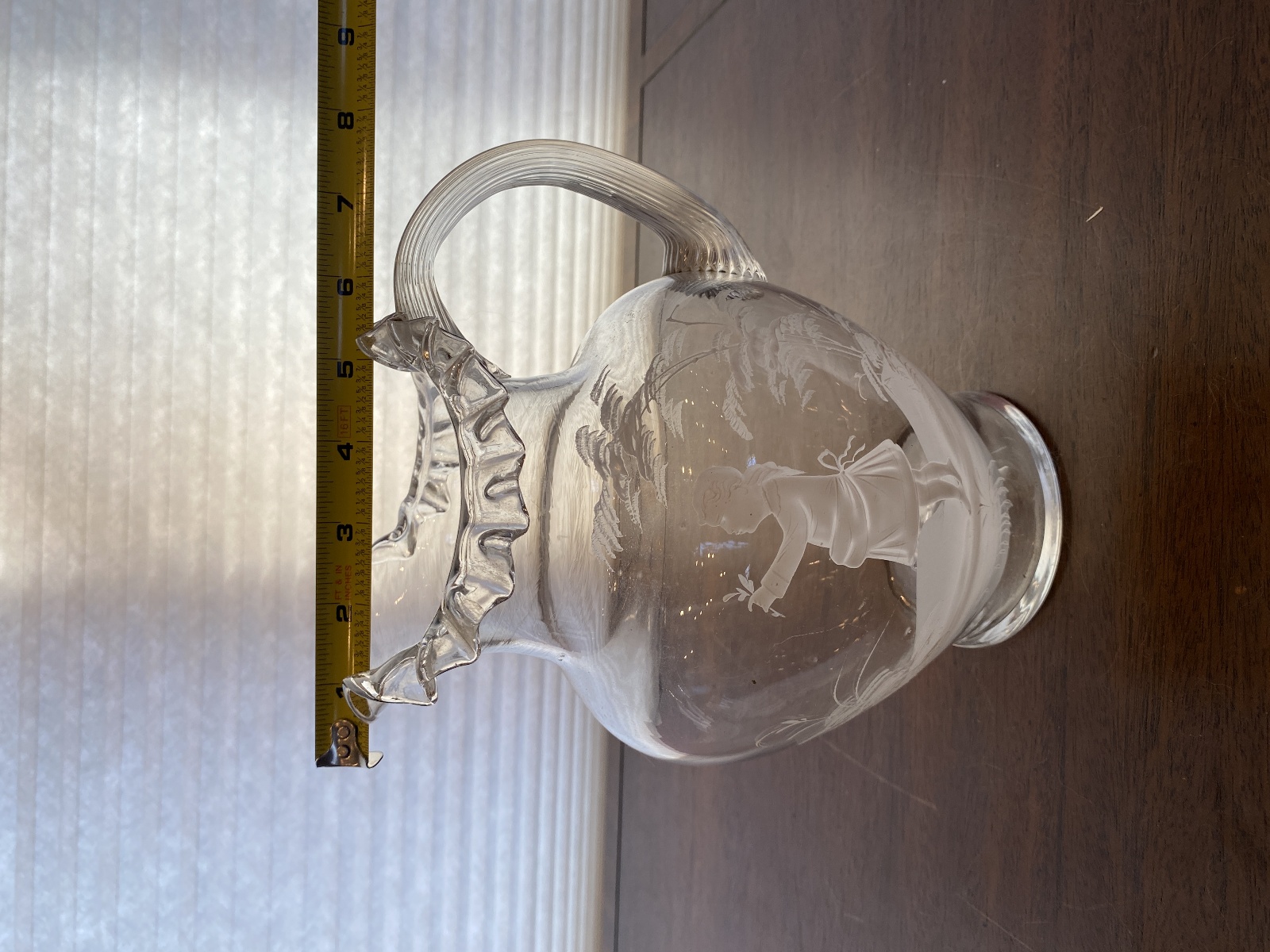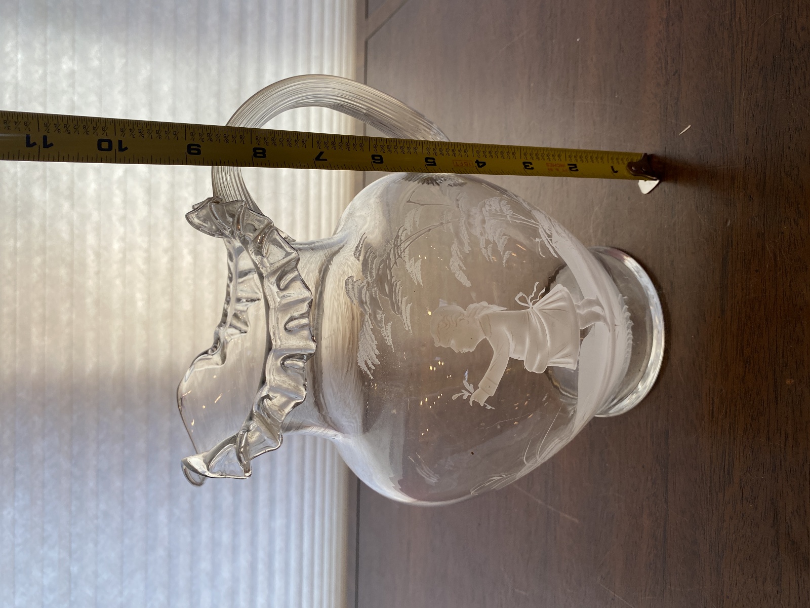 VTG Clear MARY GREGORY Nature Scene Glass Pitcher HAND PAINTED 9"H