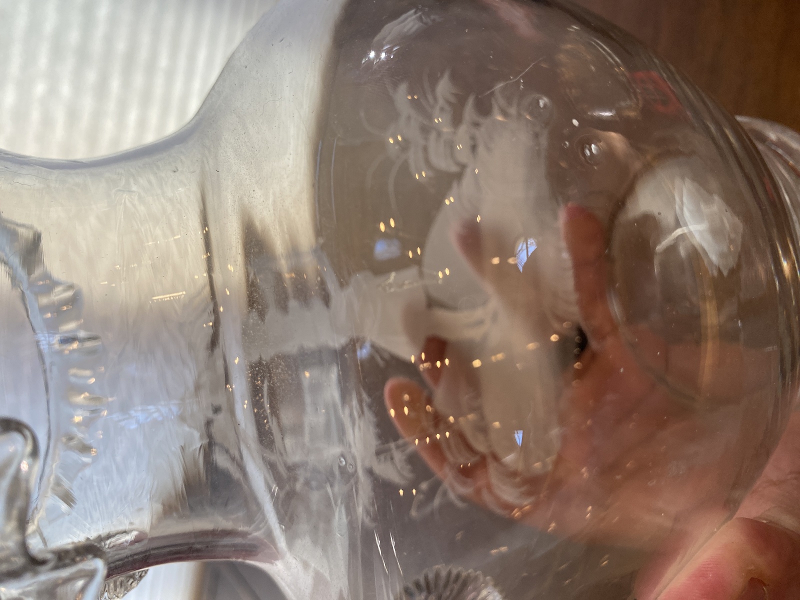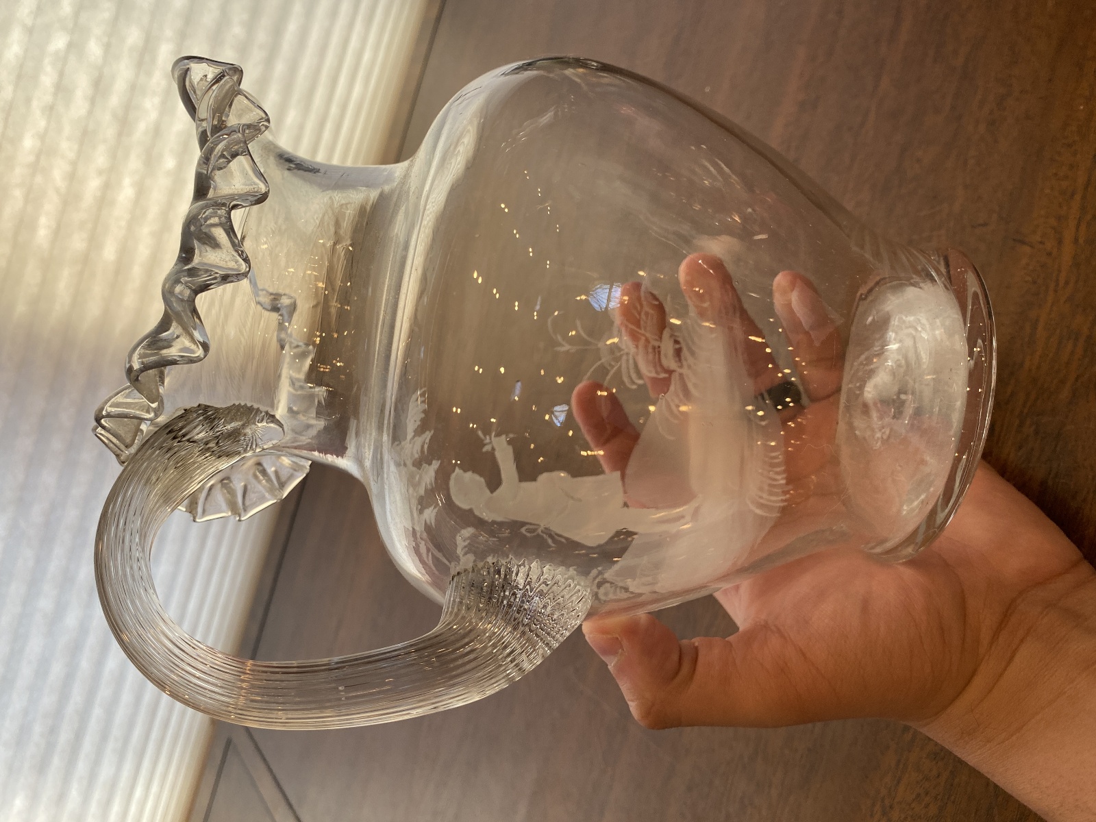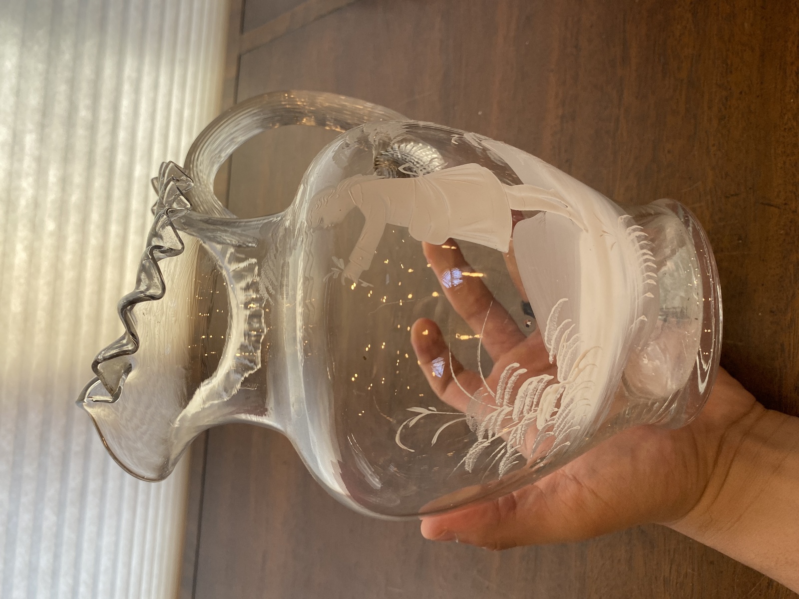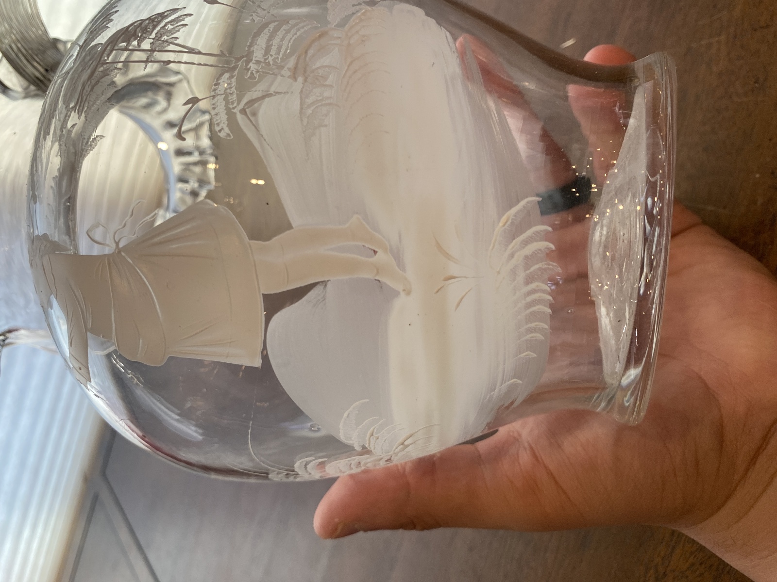 VTG Clear MARY GREGORY Nature Scene Glass Pitcher HAND PAINTED 9"H