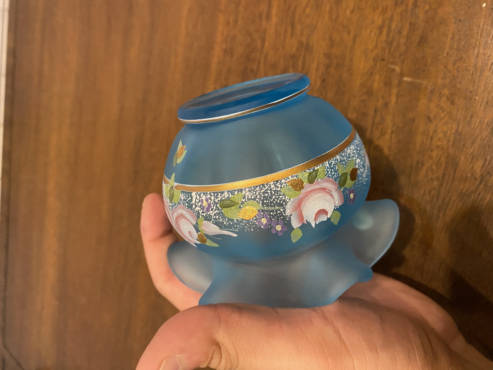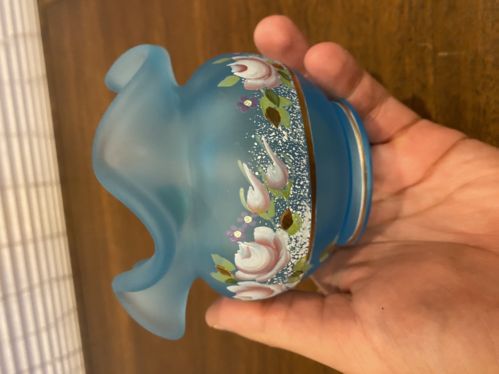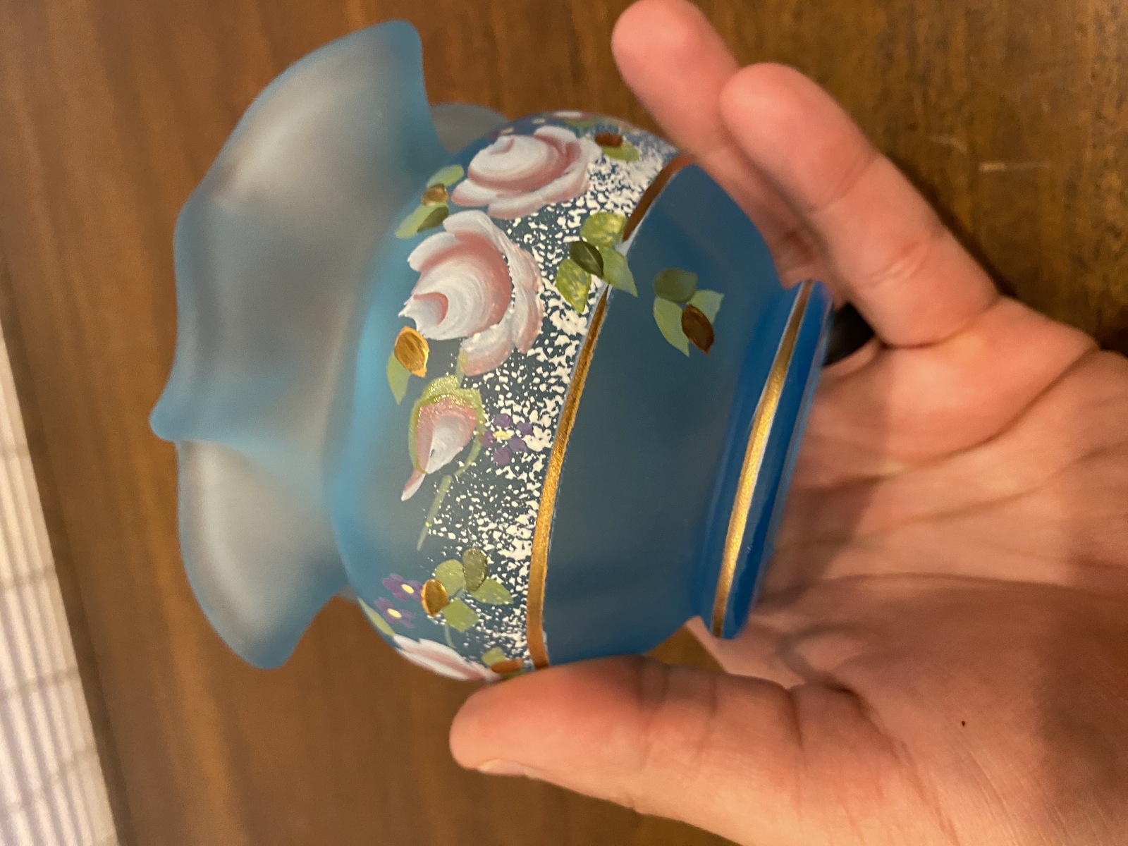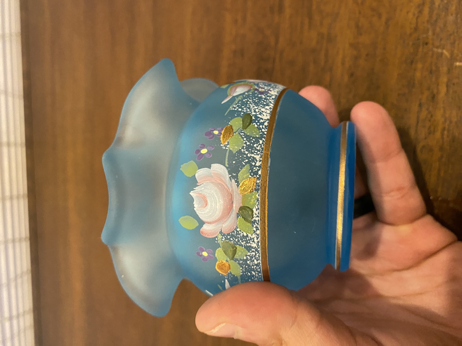 VTG FENTON Satin Blue Floral PAINTED Art Glass Rose Bowl Vase 3.75"H SIGNED