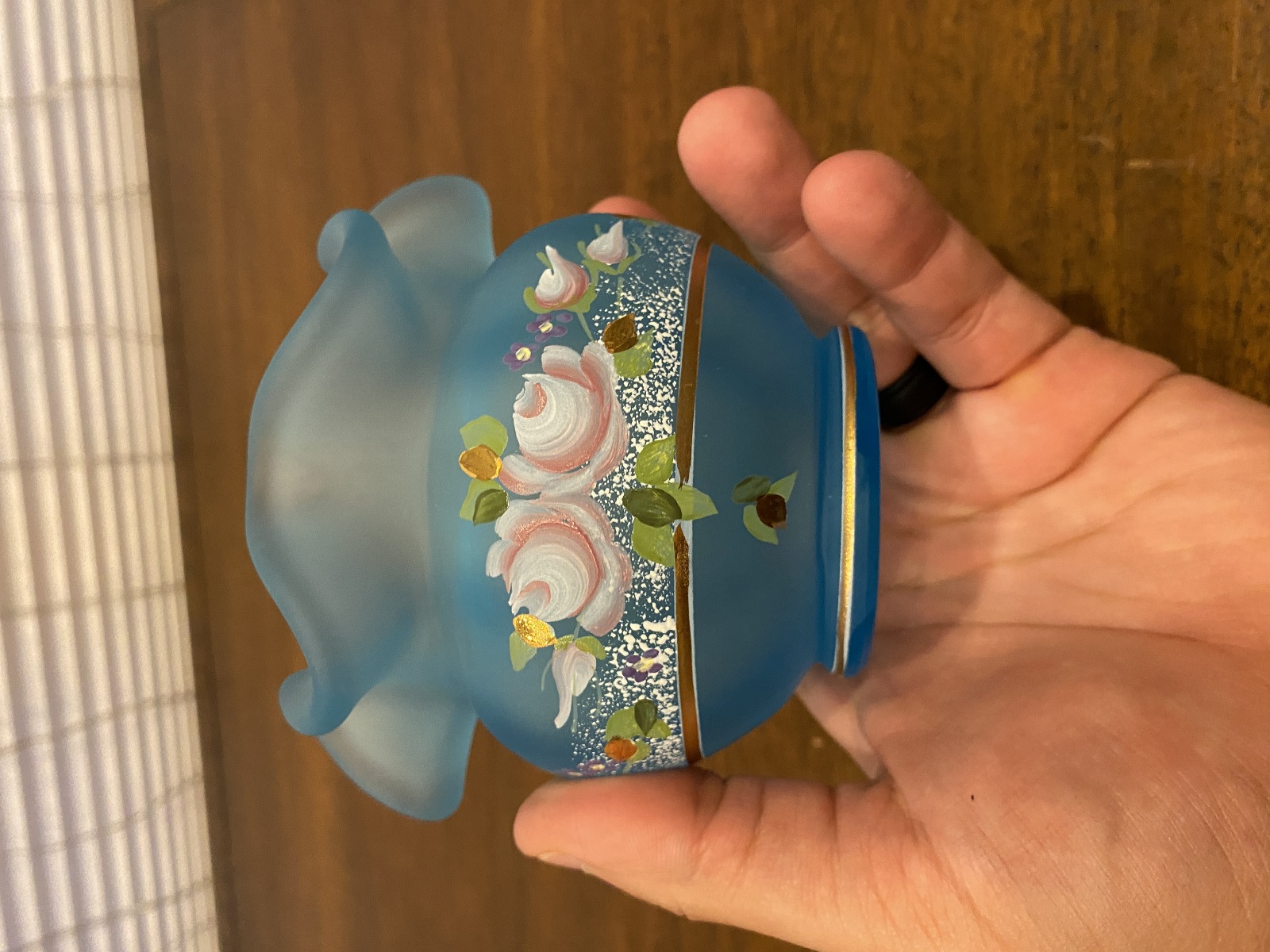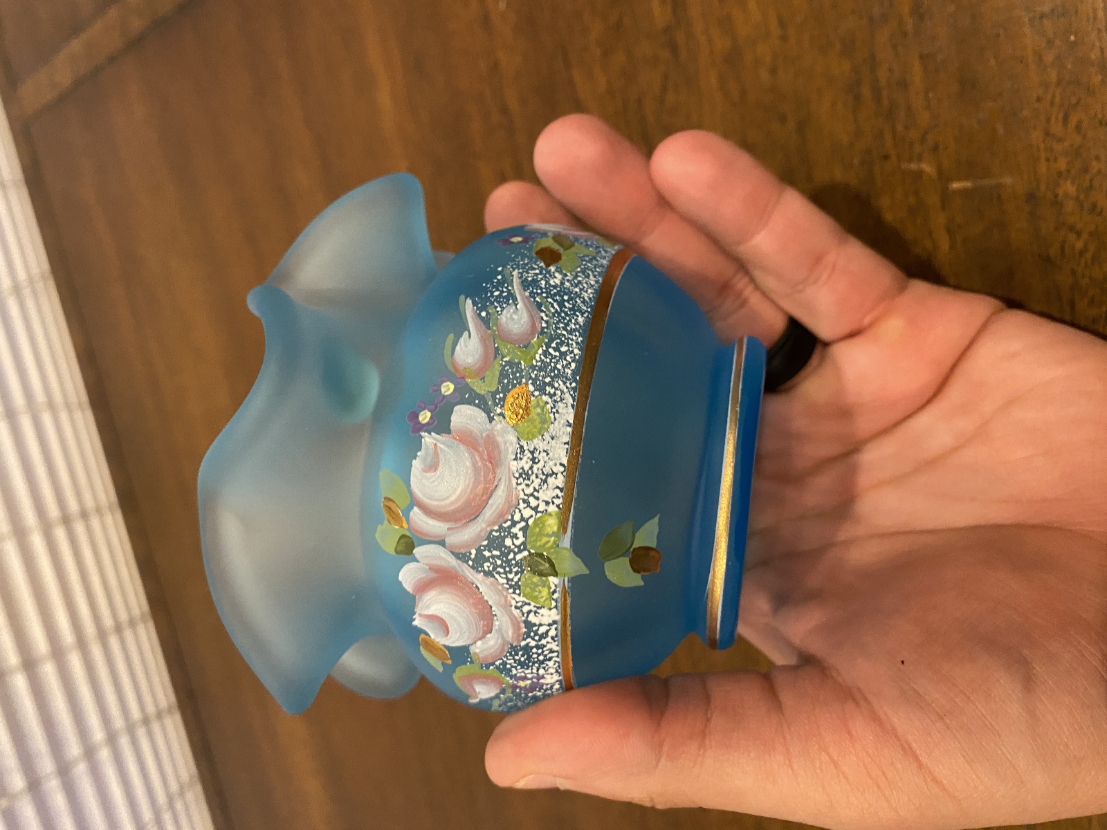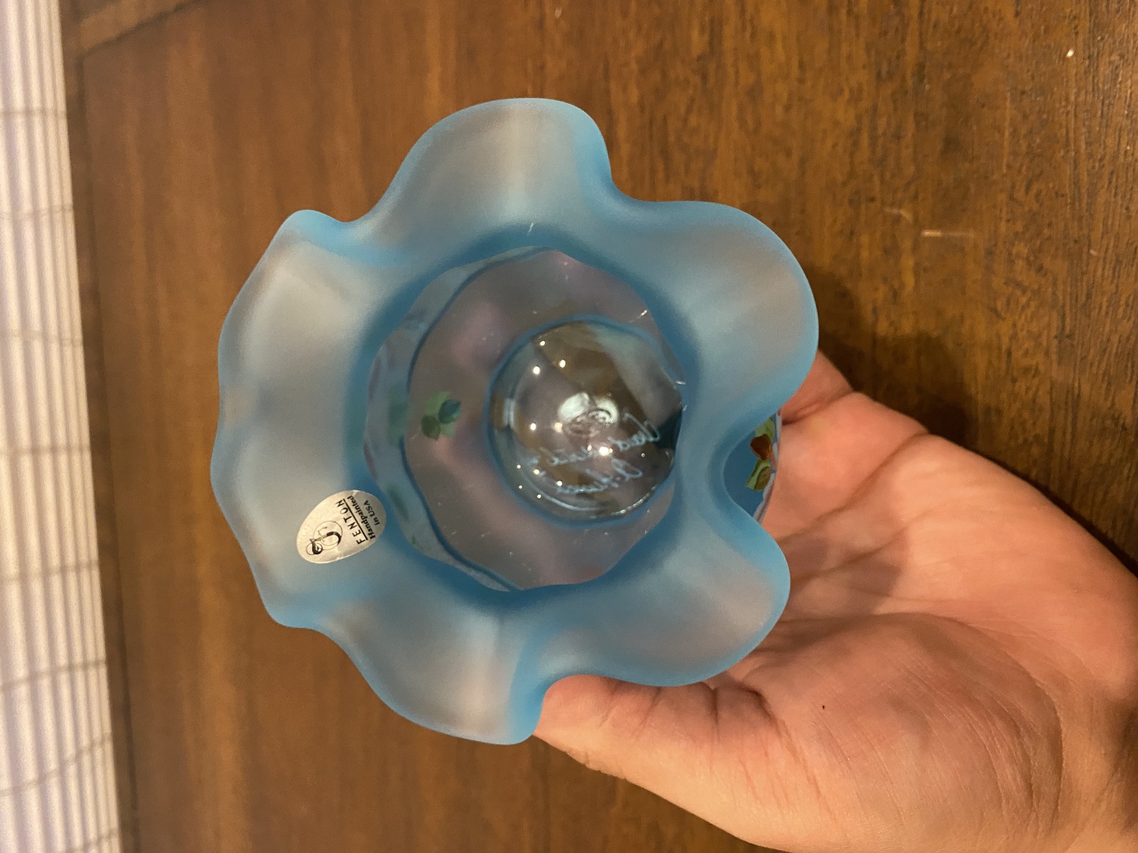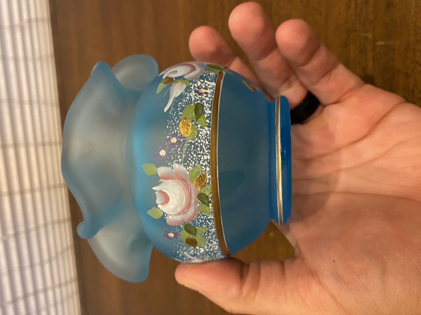 VTG FENTON Satin Blue Floral PAINTED Art Glass Rose Bowl Vase 3.75"H SIGNED
