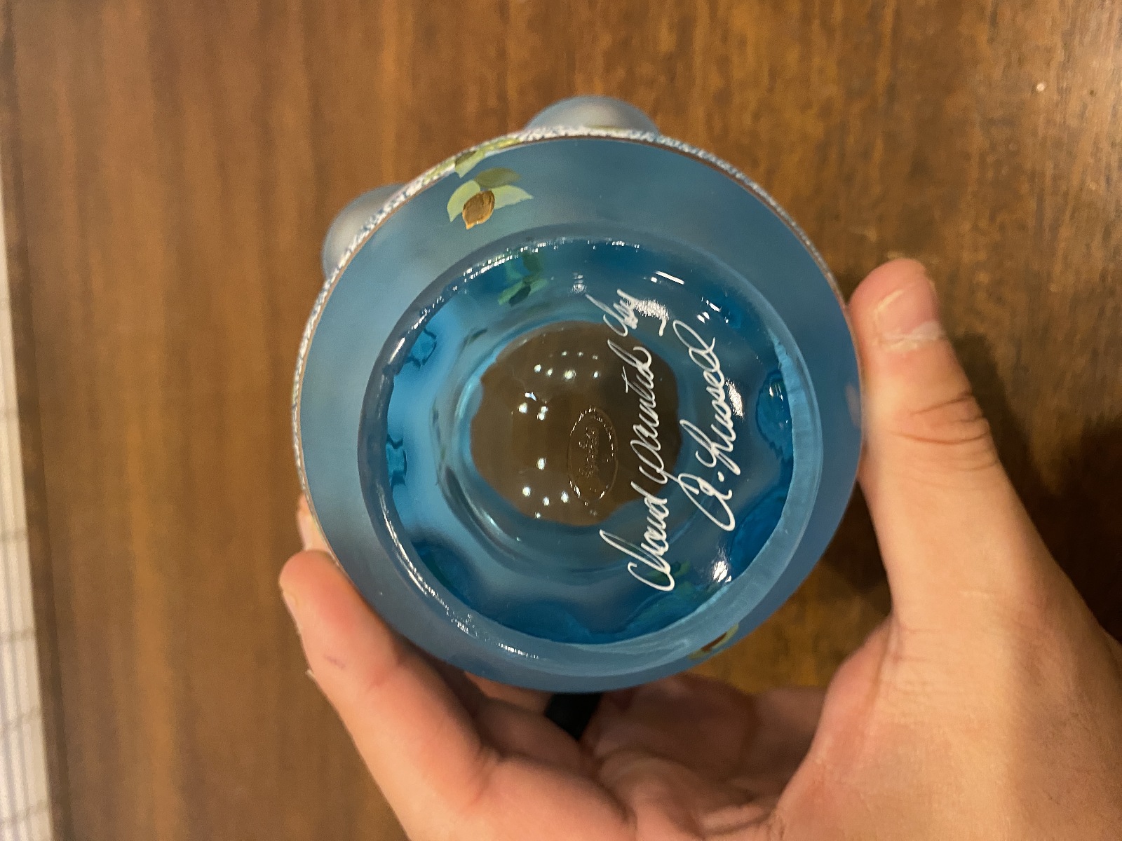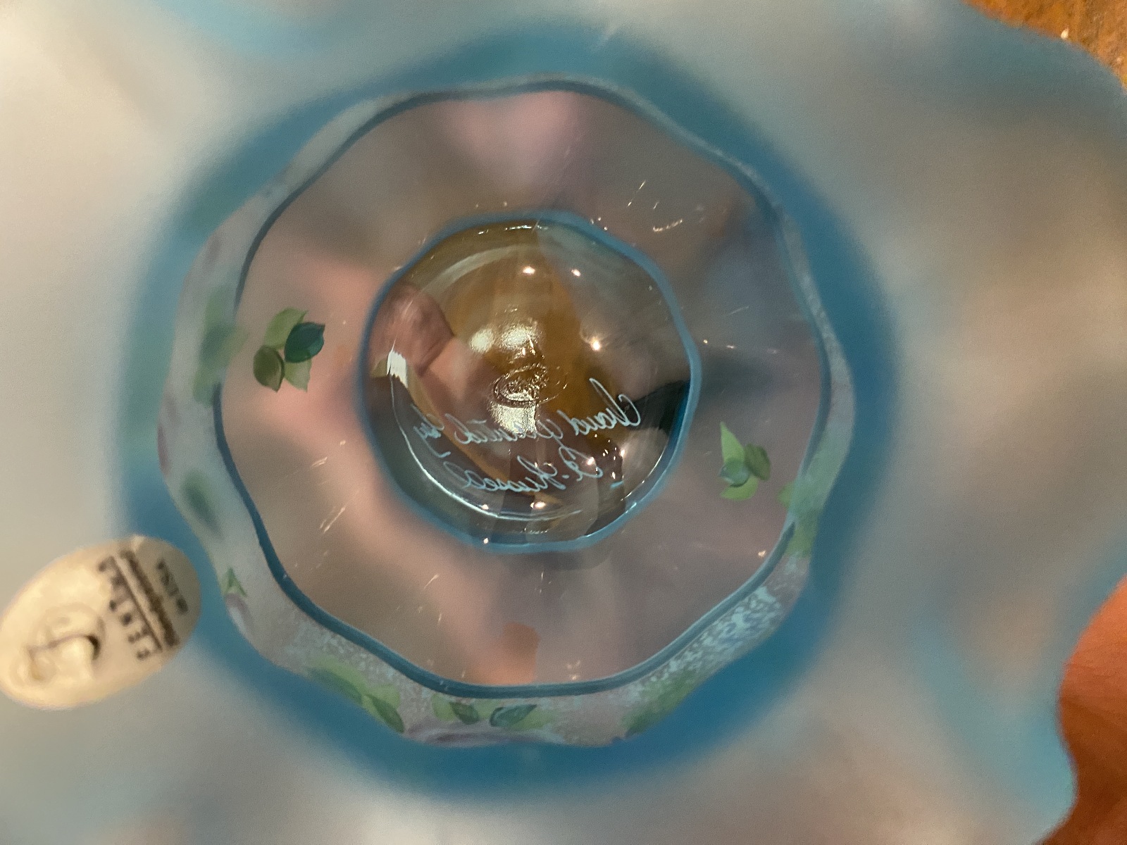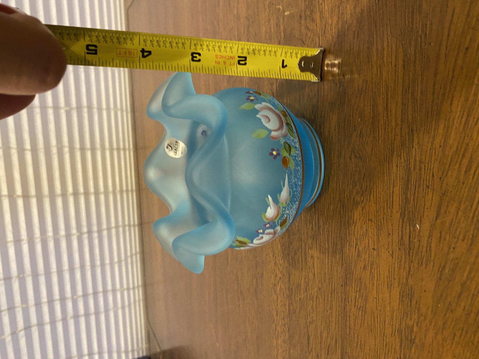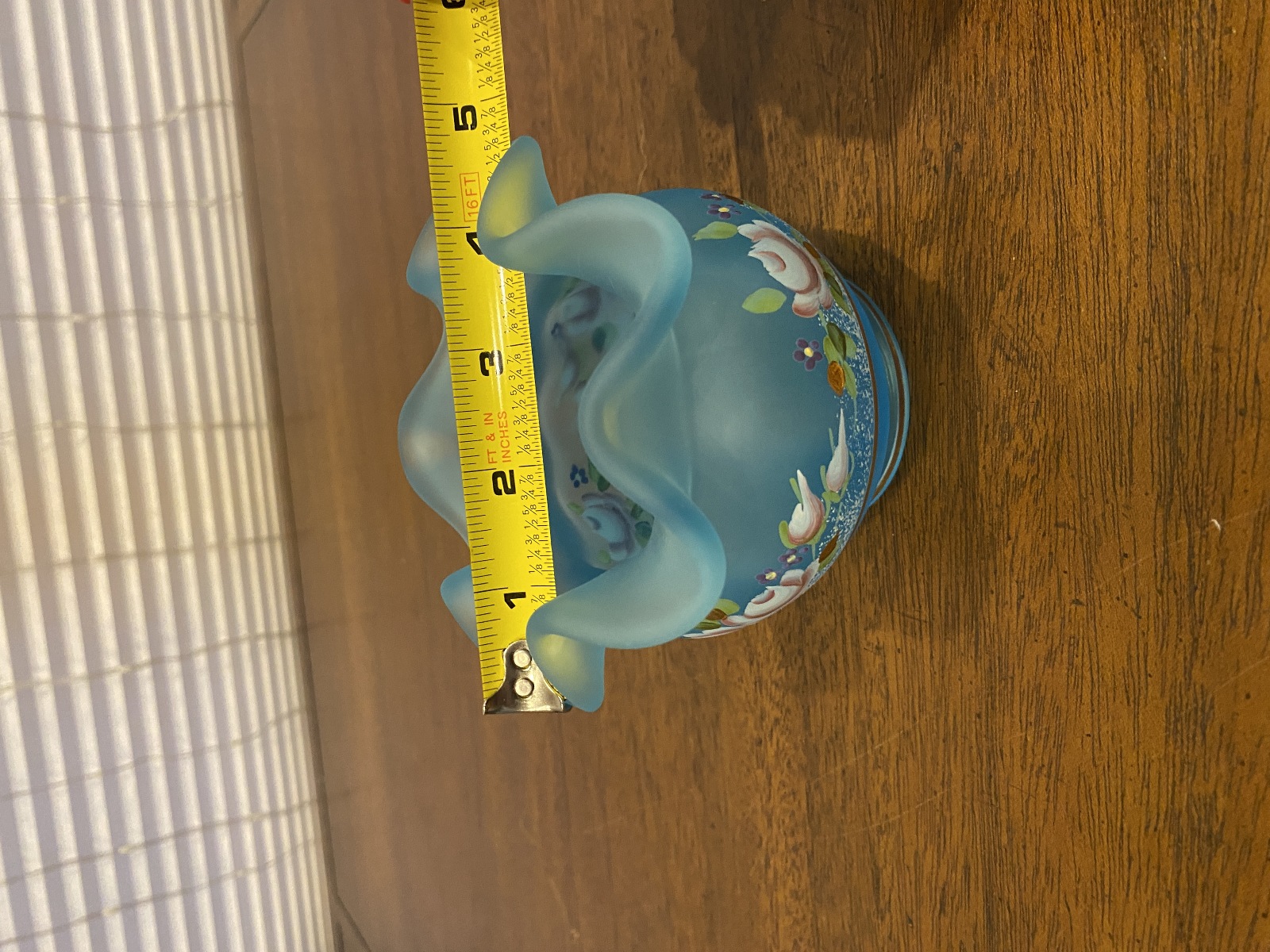 VTG FENTON Satin Blue Floral PAINTED Art Glass Rose Bowl Vase 3.75"H SIGNED