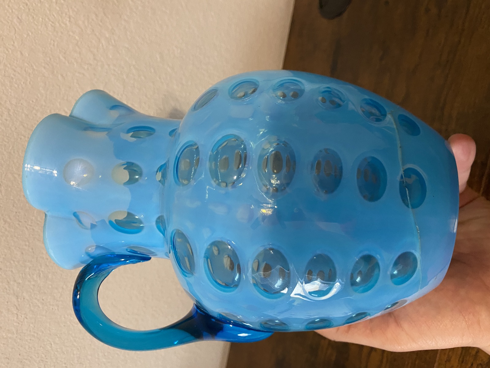 VTG FENTON Blue Opalescent COIN DOT Glass Pitcher + 2 Tumblers SET(3) DAMAGED