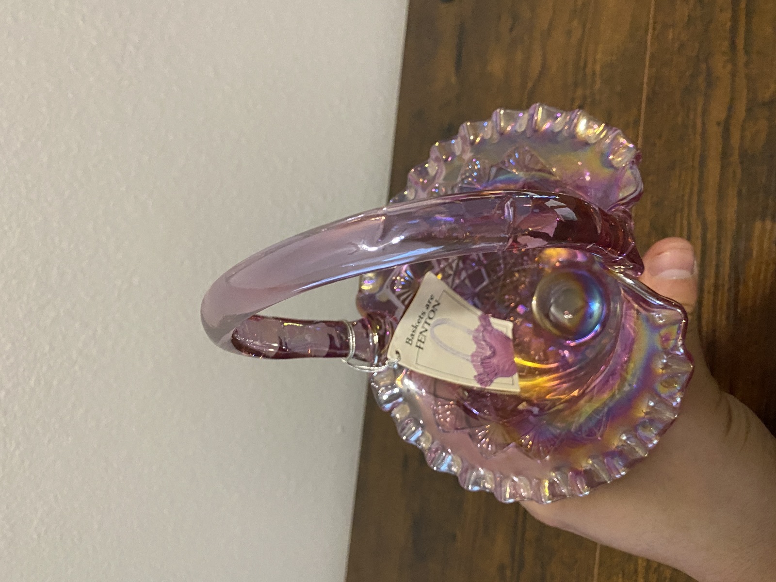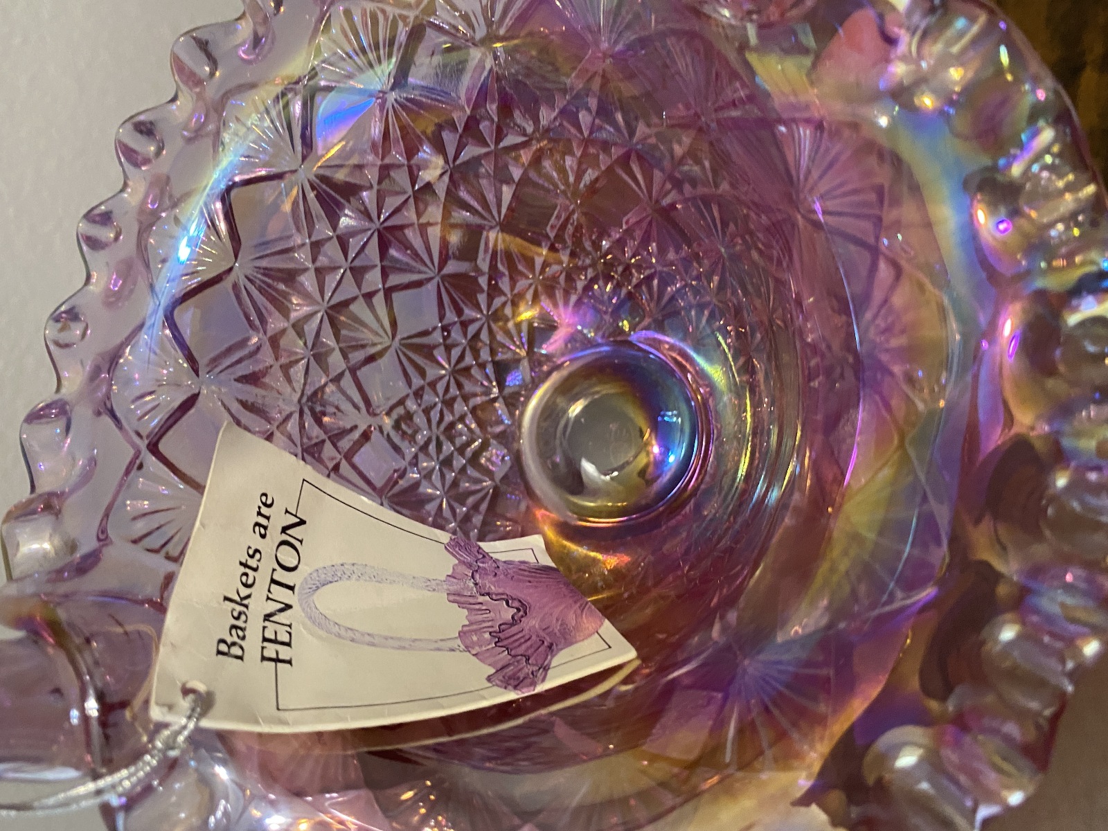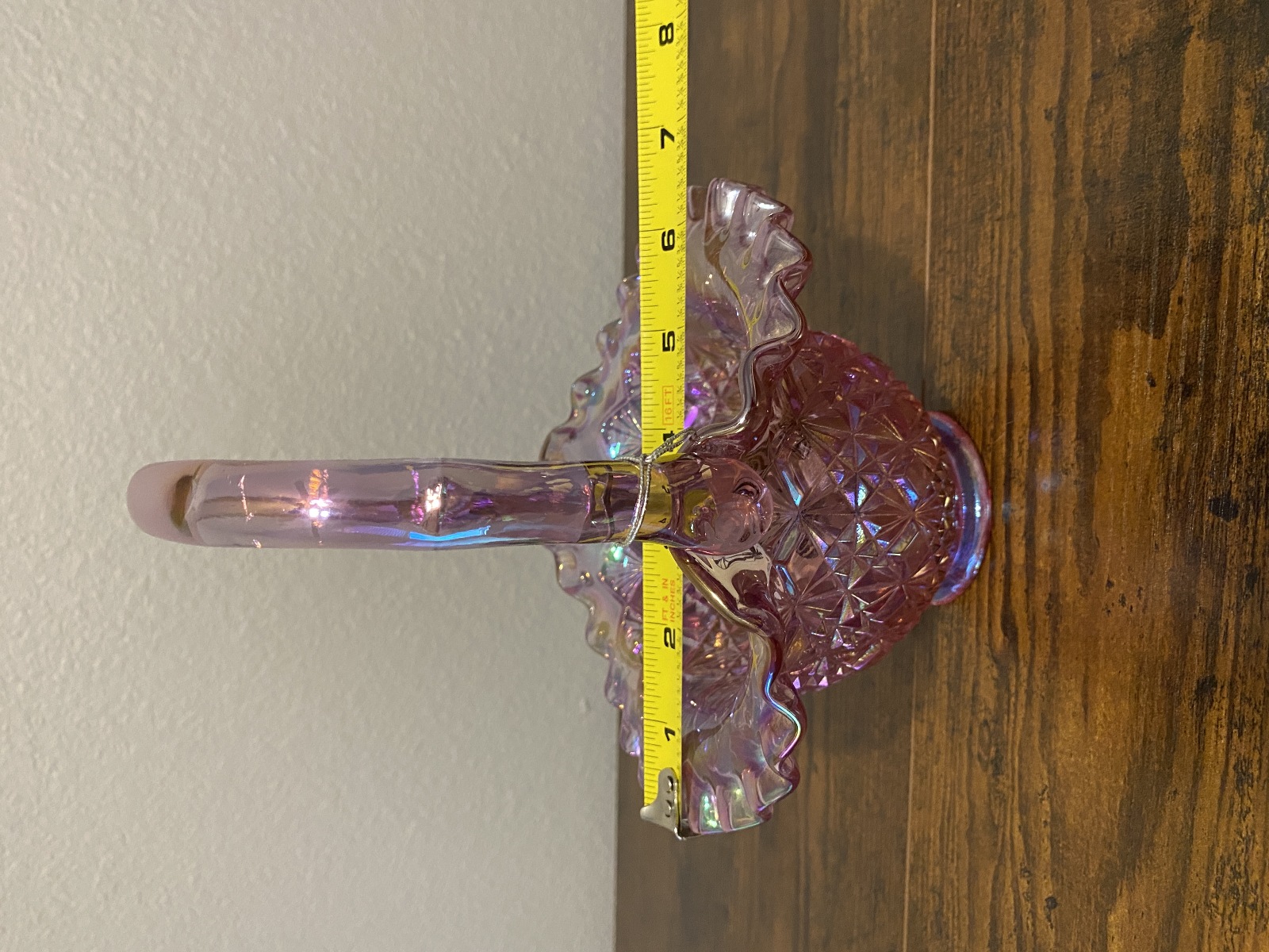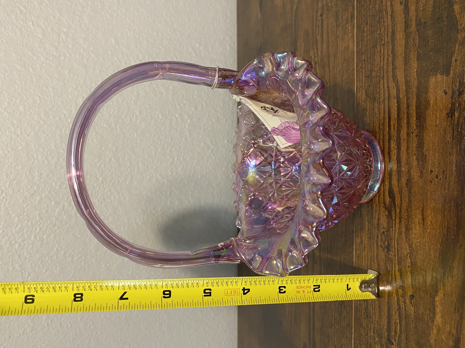 VTG FENTON Pink Iridescent FINE CUT & BLOCK Ruffled Rim Art Glass Basket 8.25"H