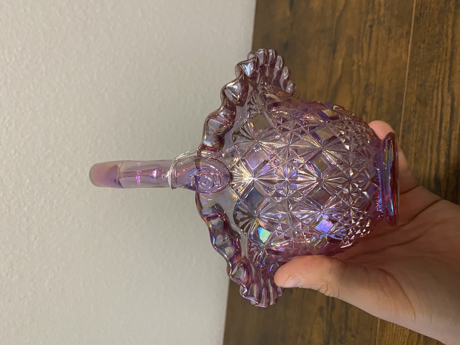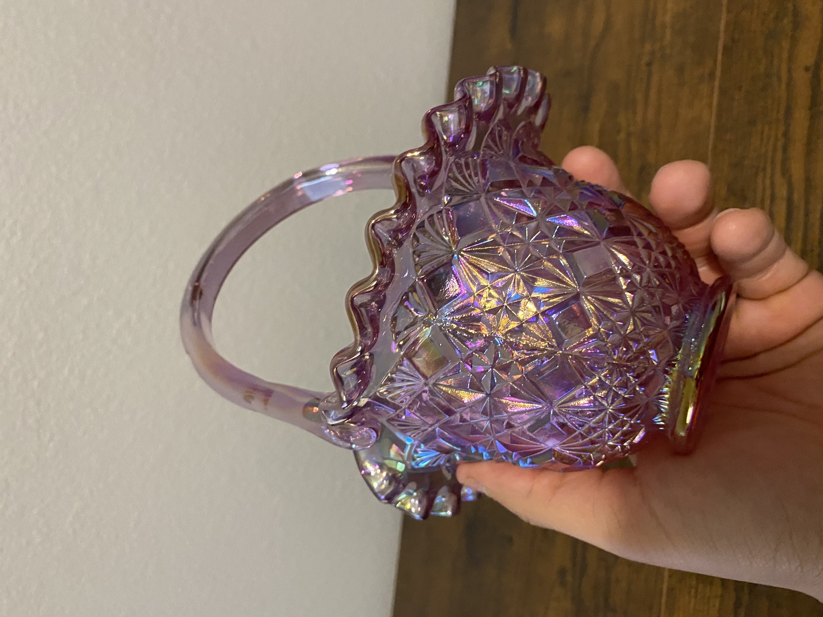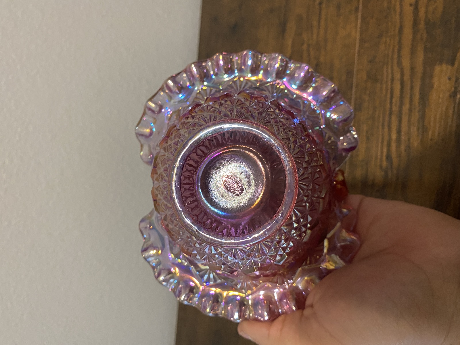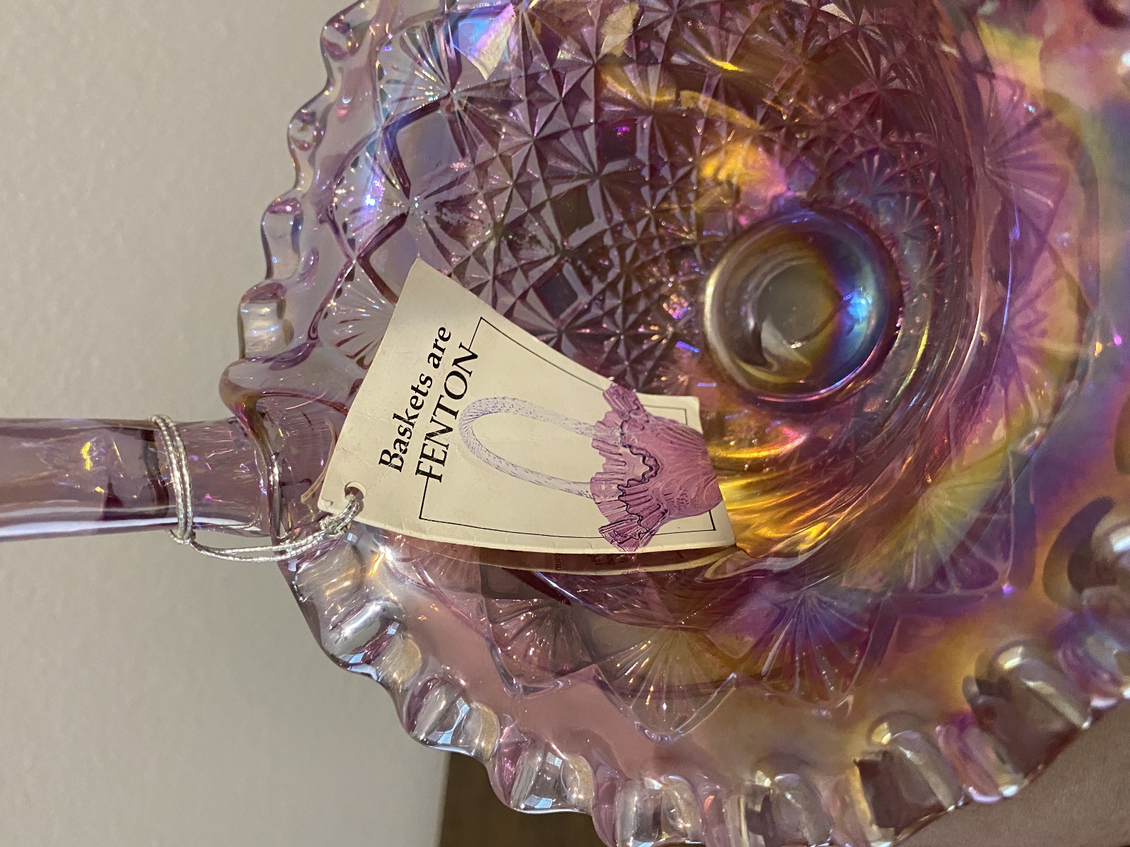 VTG FENTON Pink Iridescent FINE CUT & BLOCK Ruffled Rim Art Glass Basket 8.25"H
