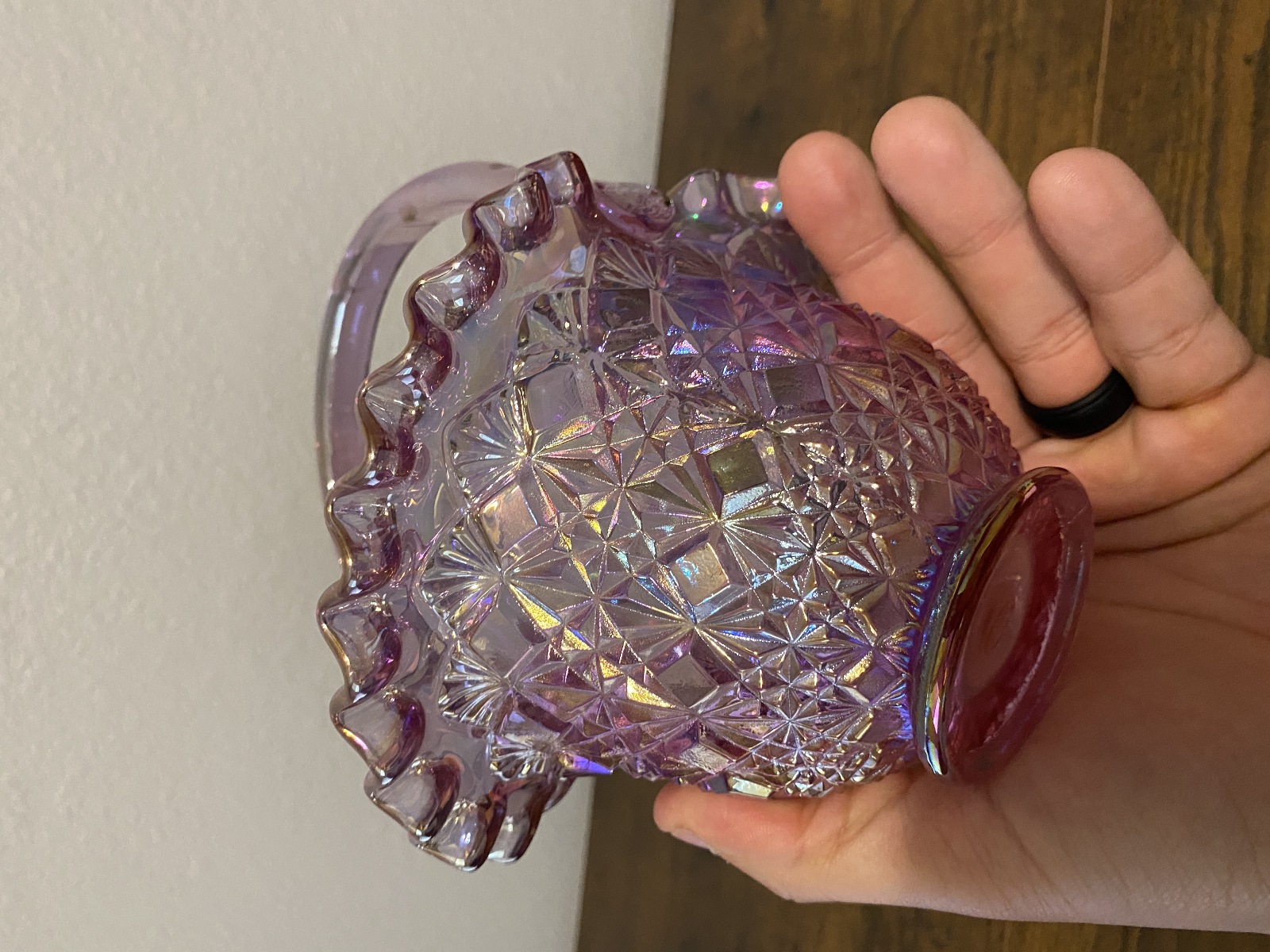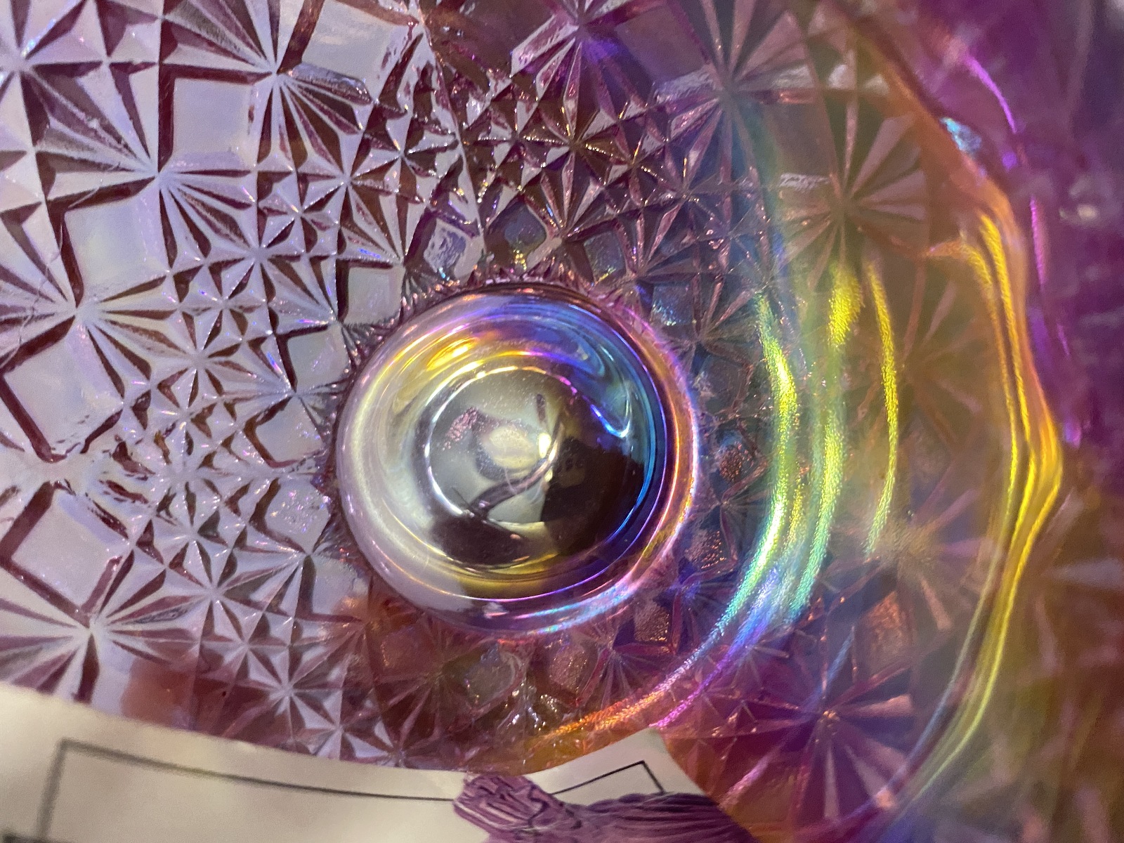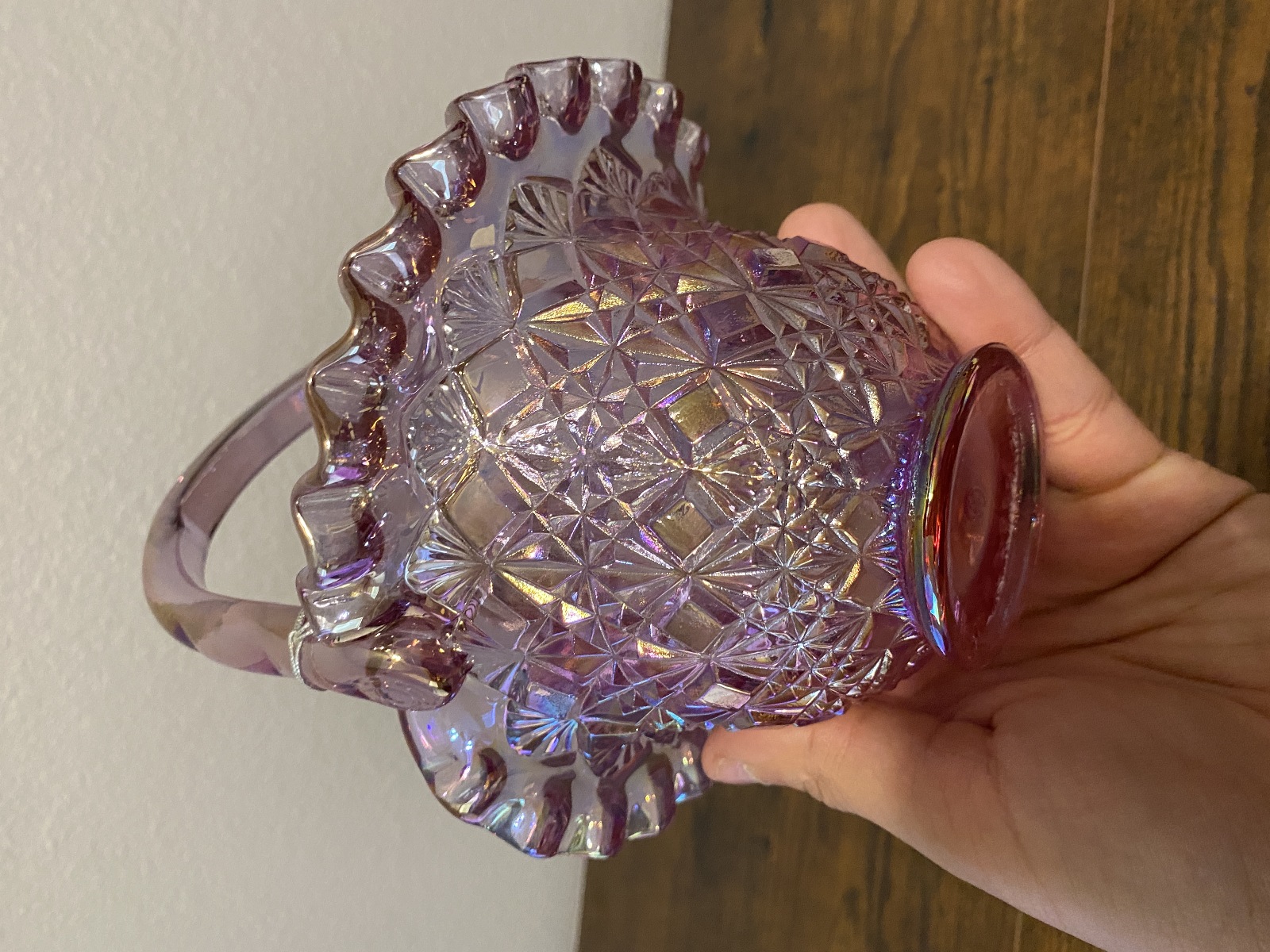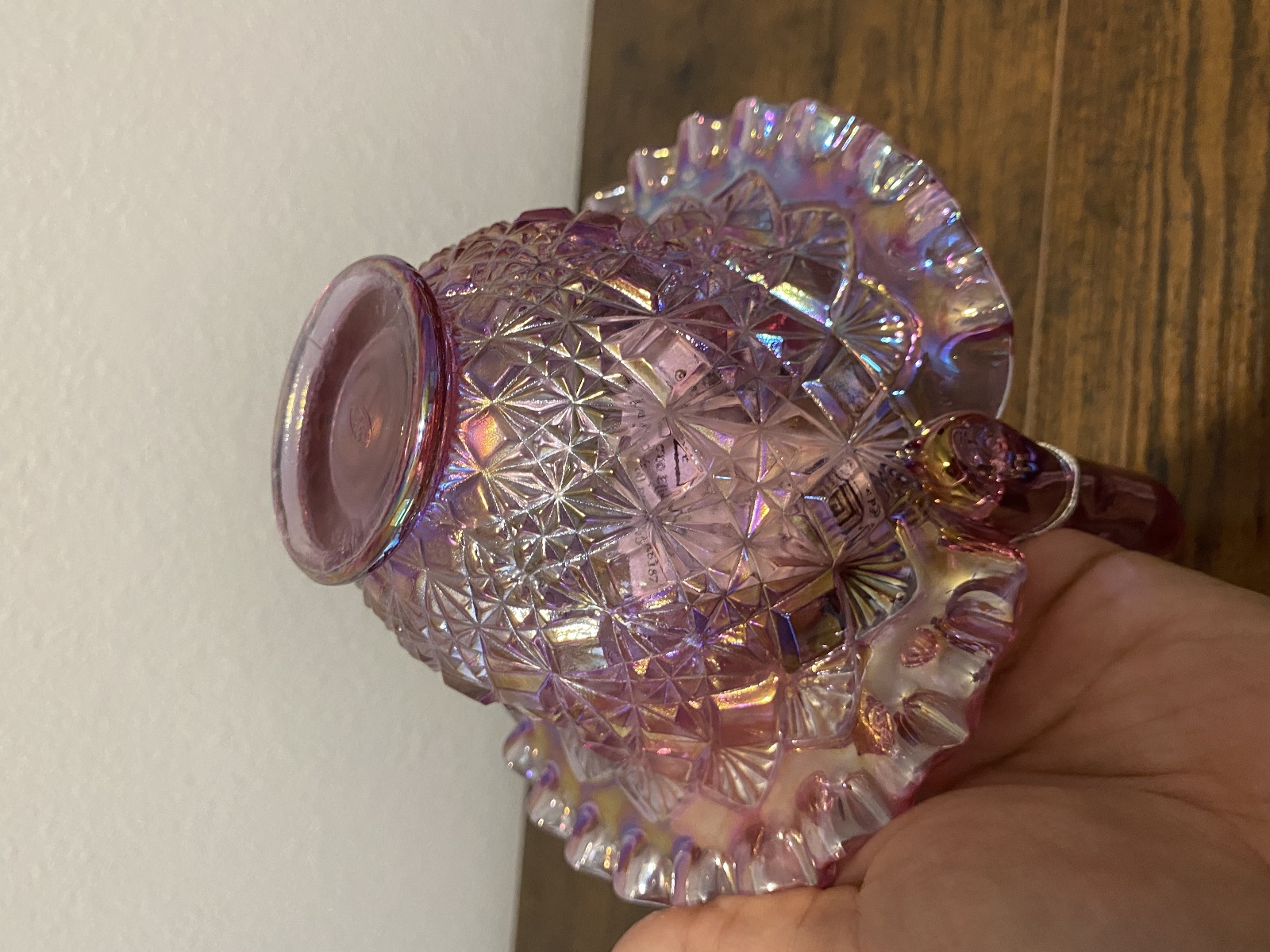 VTG FENTON Pink Iridescent FINE CUT & BLOCK Ruffled Rim Art Glass Basket 8.25"H
