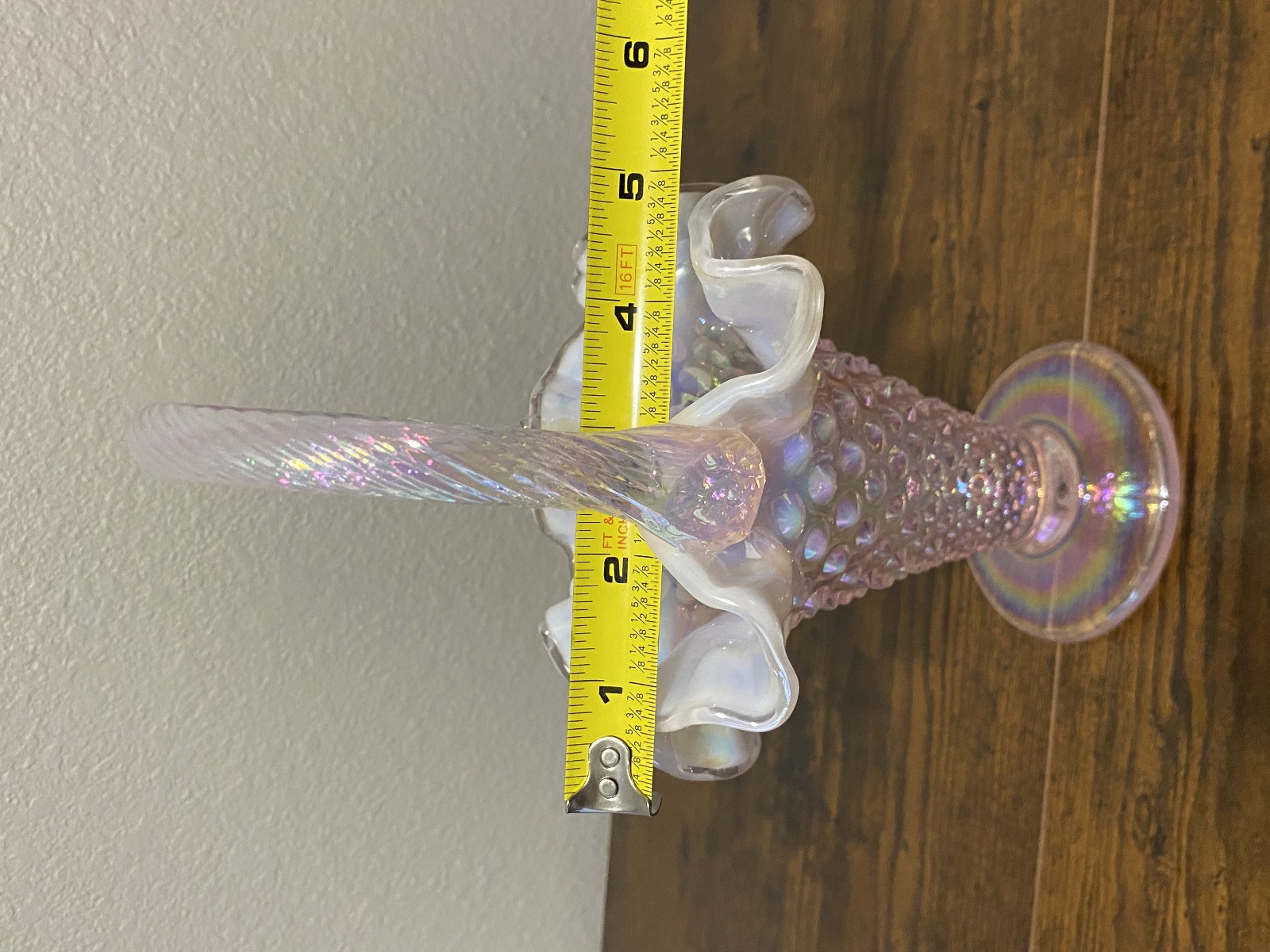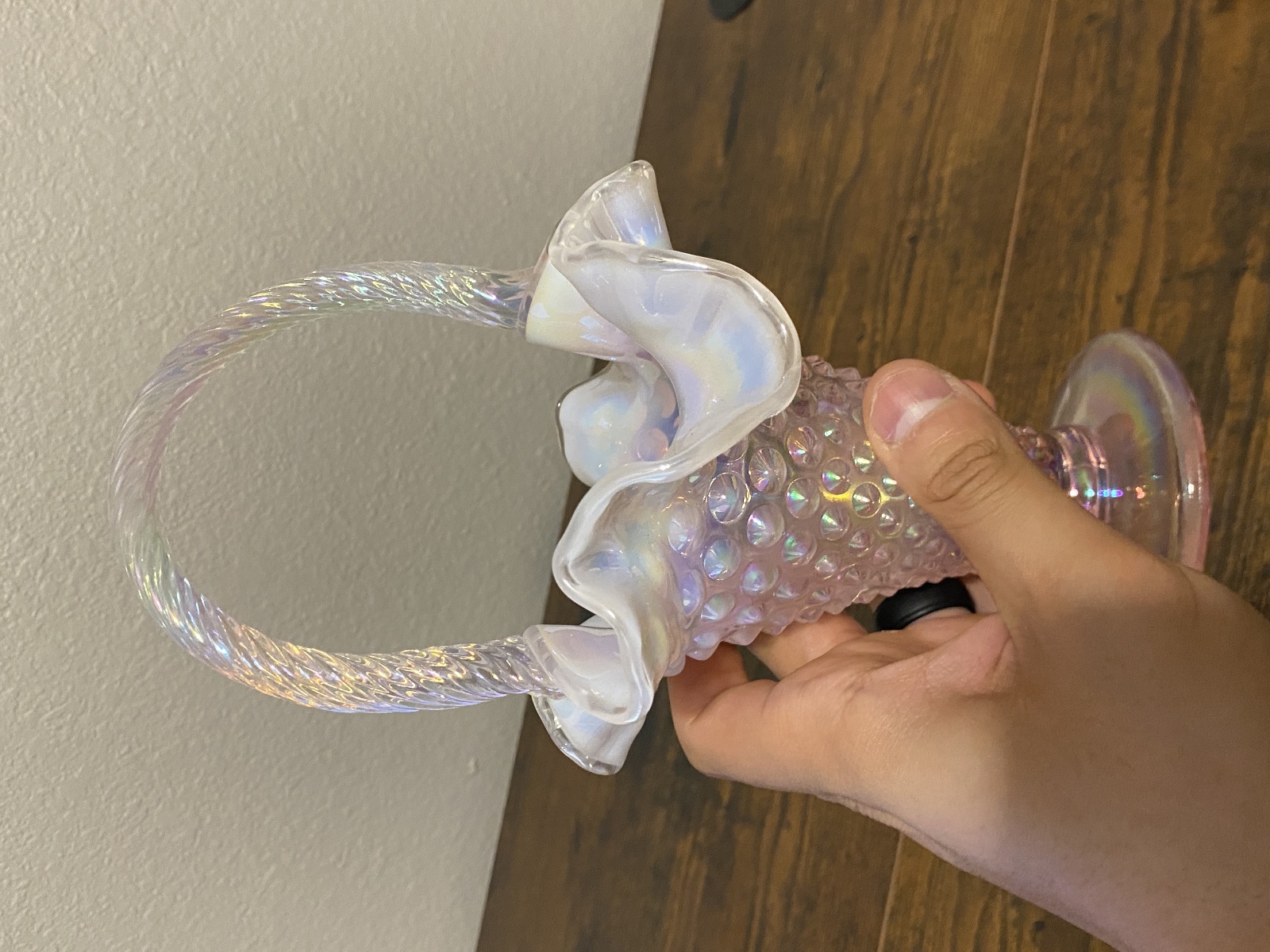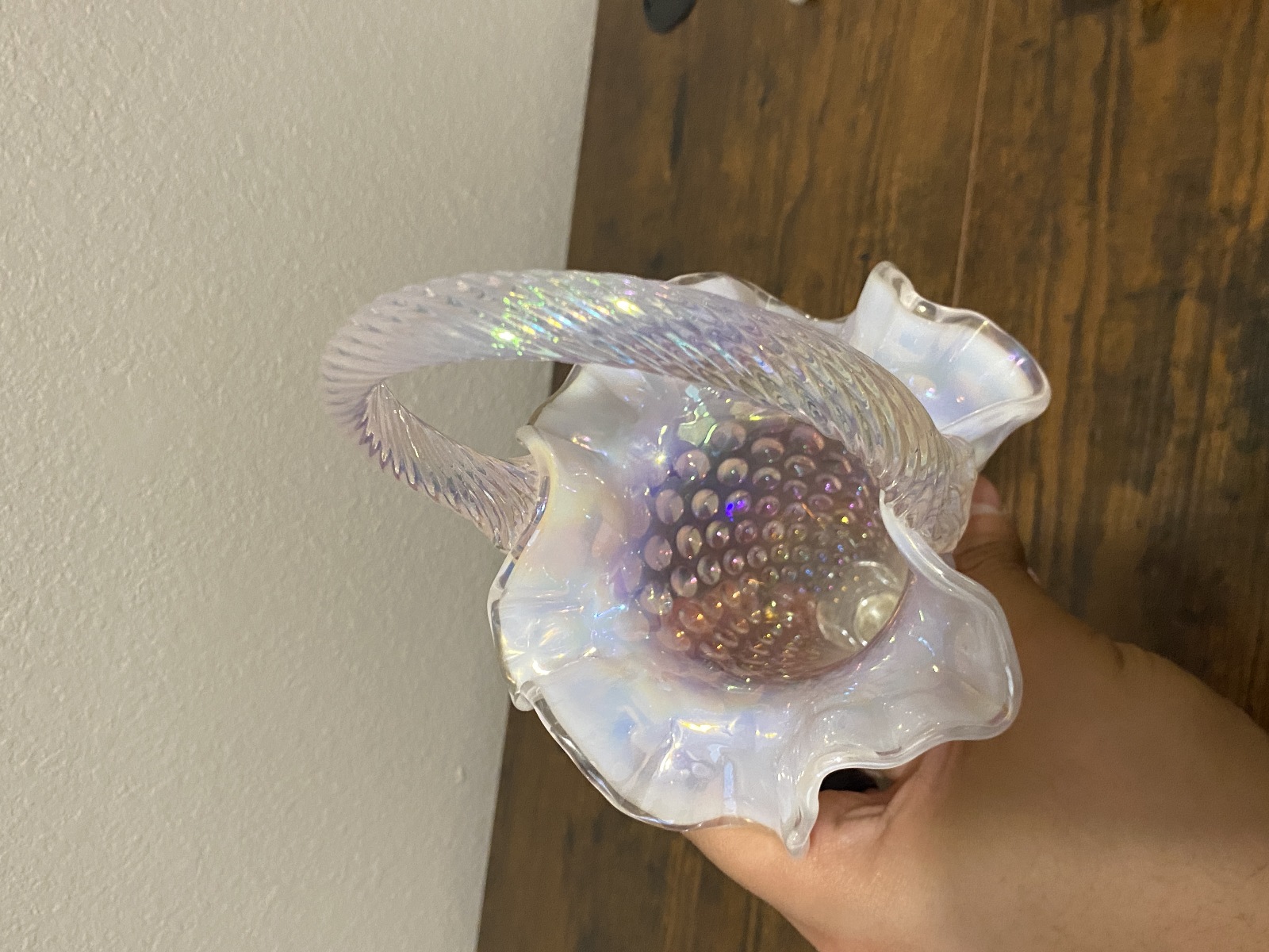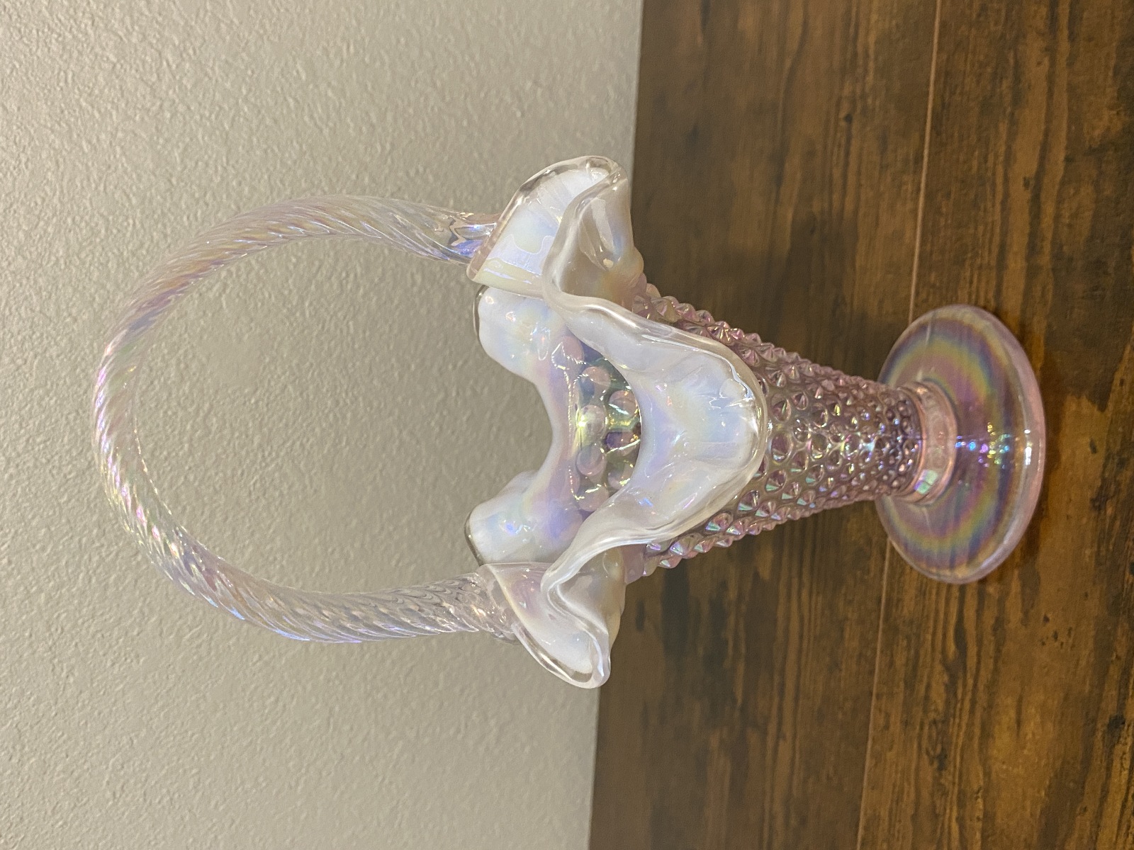 VTG FENTON Pink Opalescent Iridescent Hobnail Twisted Handle Basket 9"H