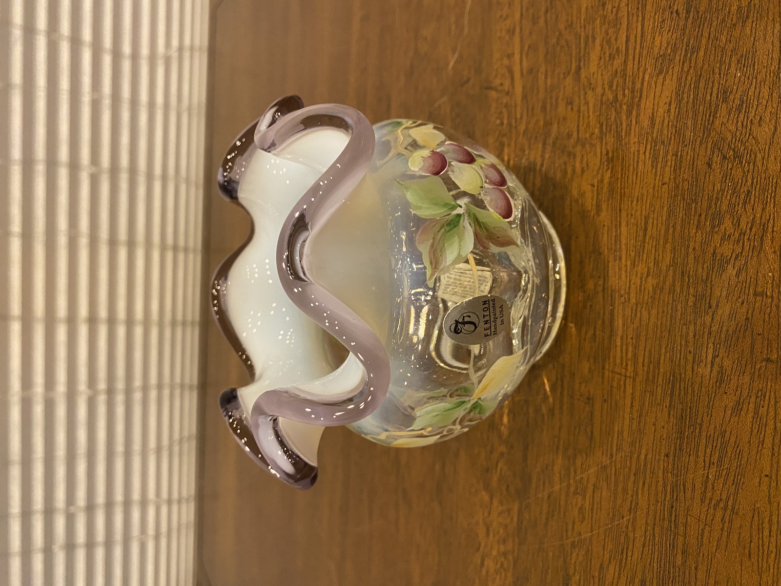 VTG FENTON Purple Opalescent Grape PAINTED Art Glass Rose Bowl Vase 4"H SIGNED