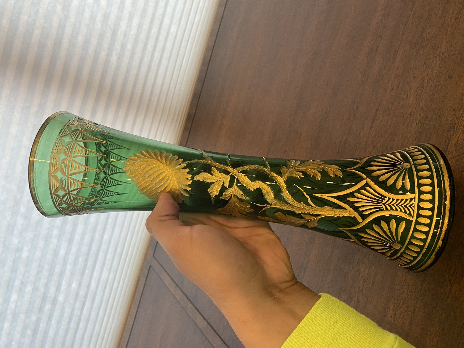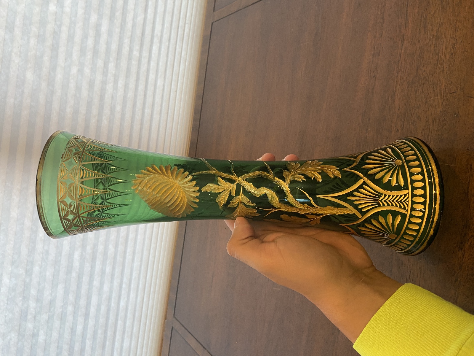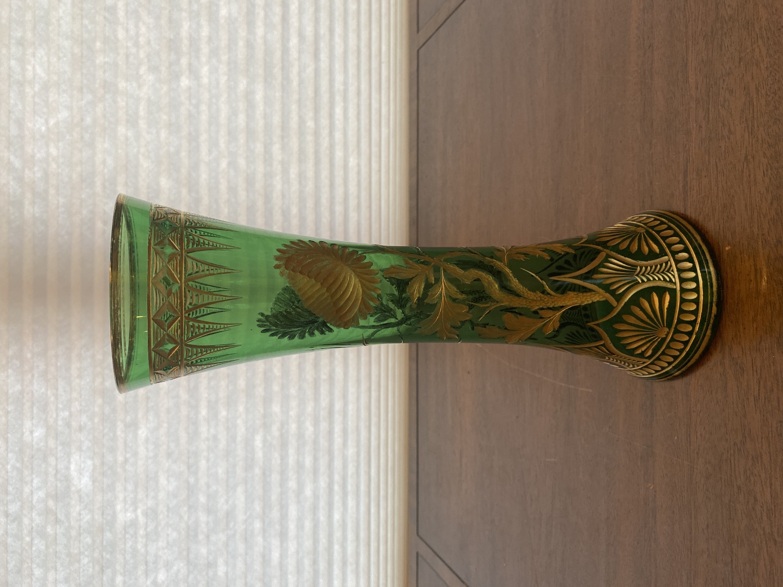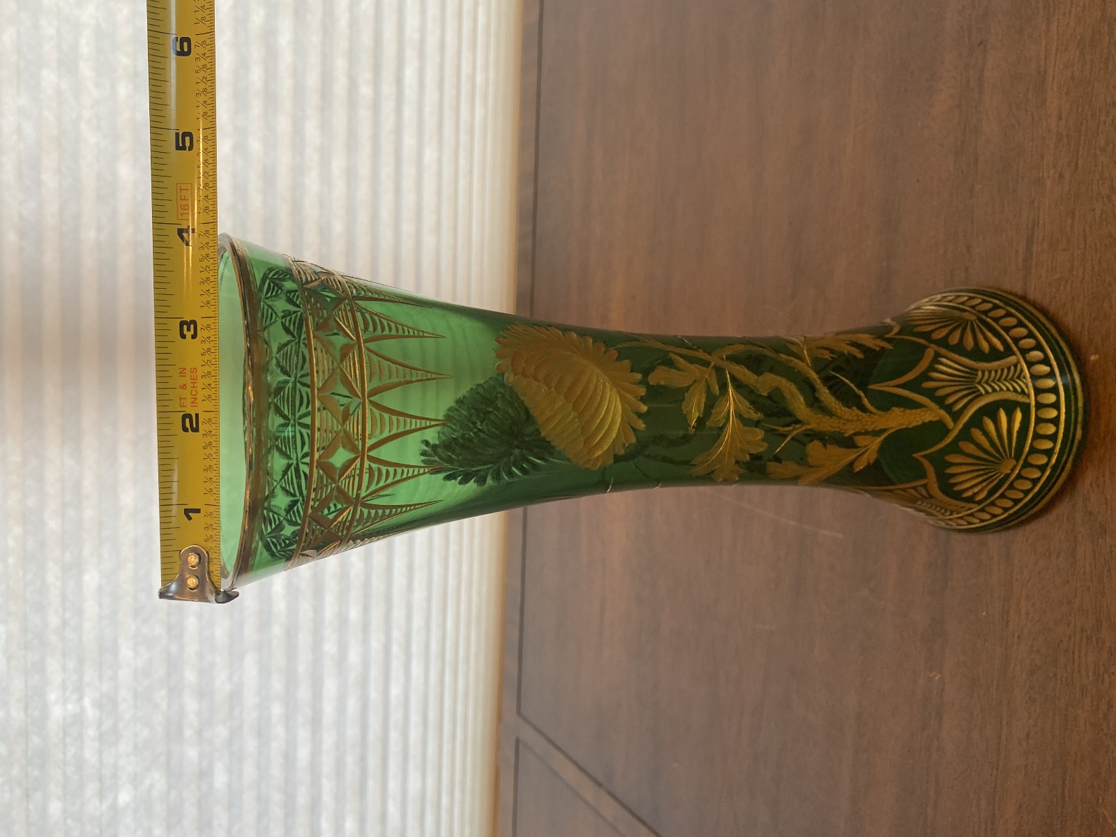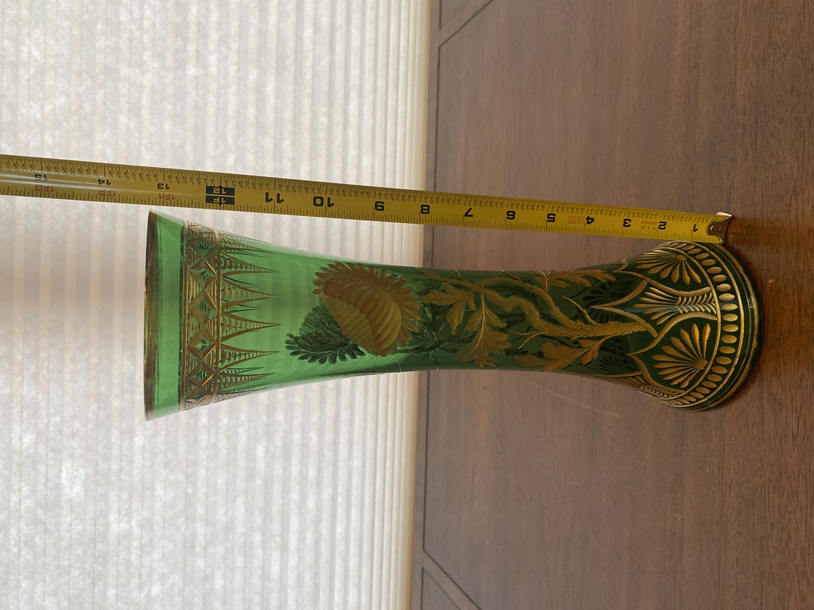VTG ART NOUVEAU Green W/Gold Floral Etched Pattern Art Glass Vase 13.25"H