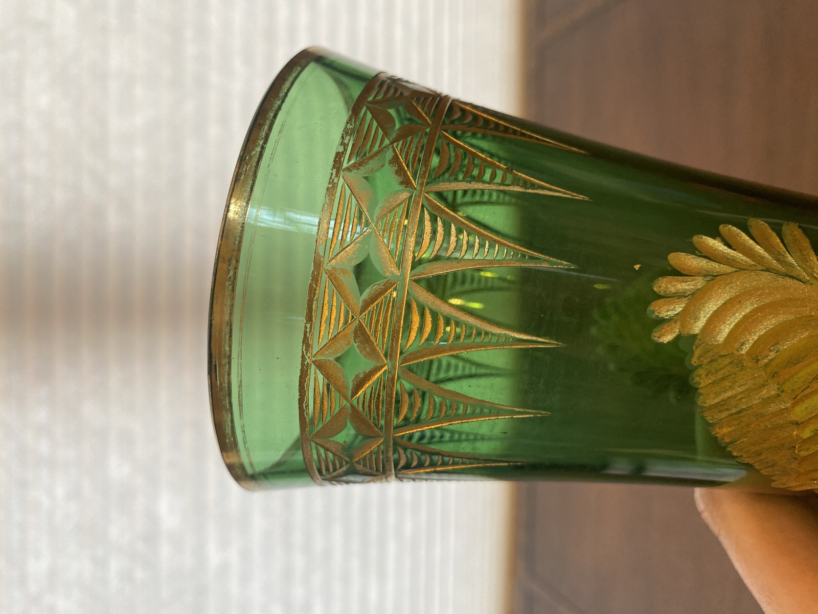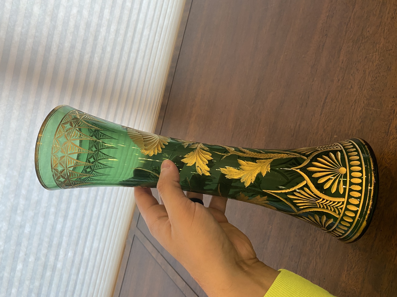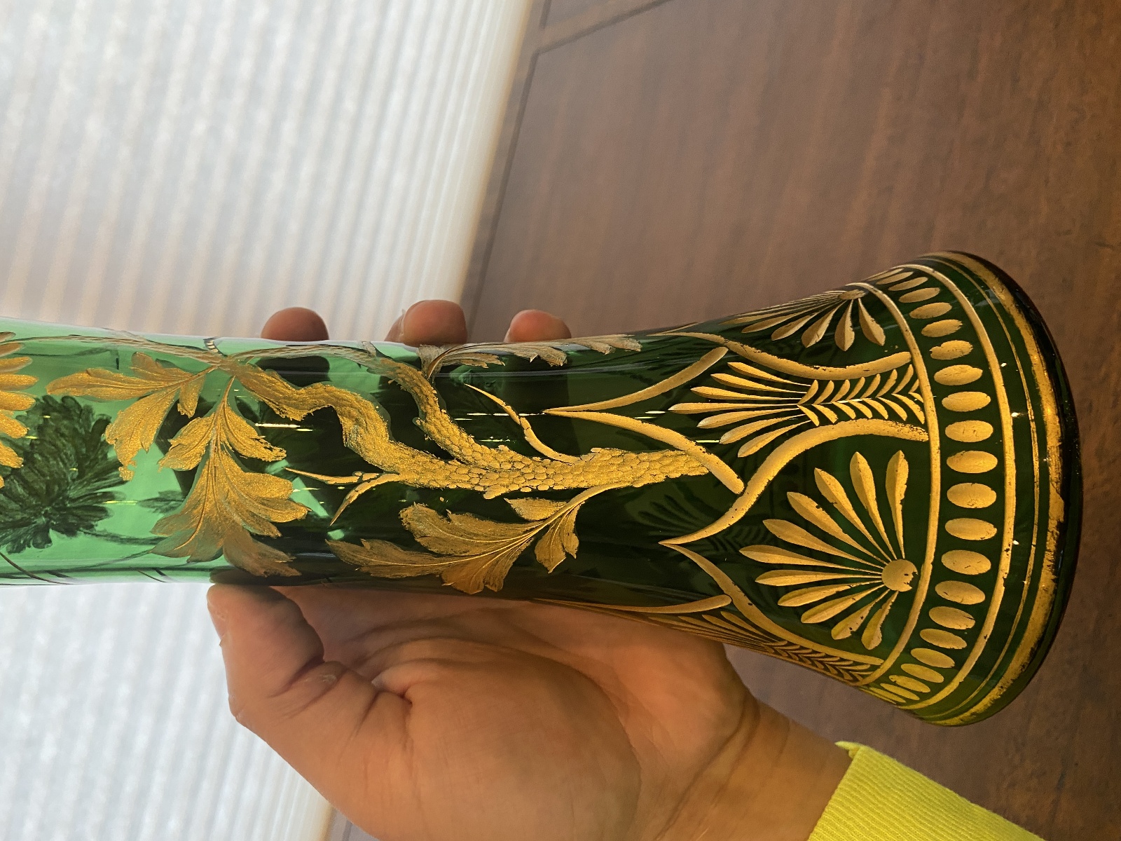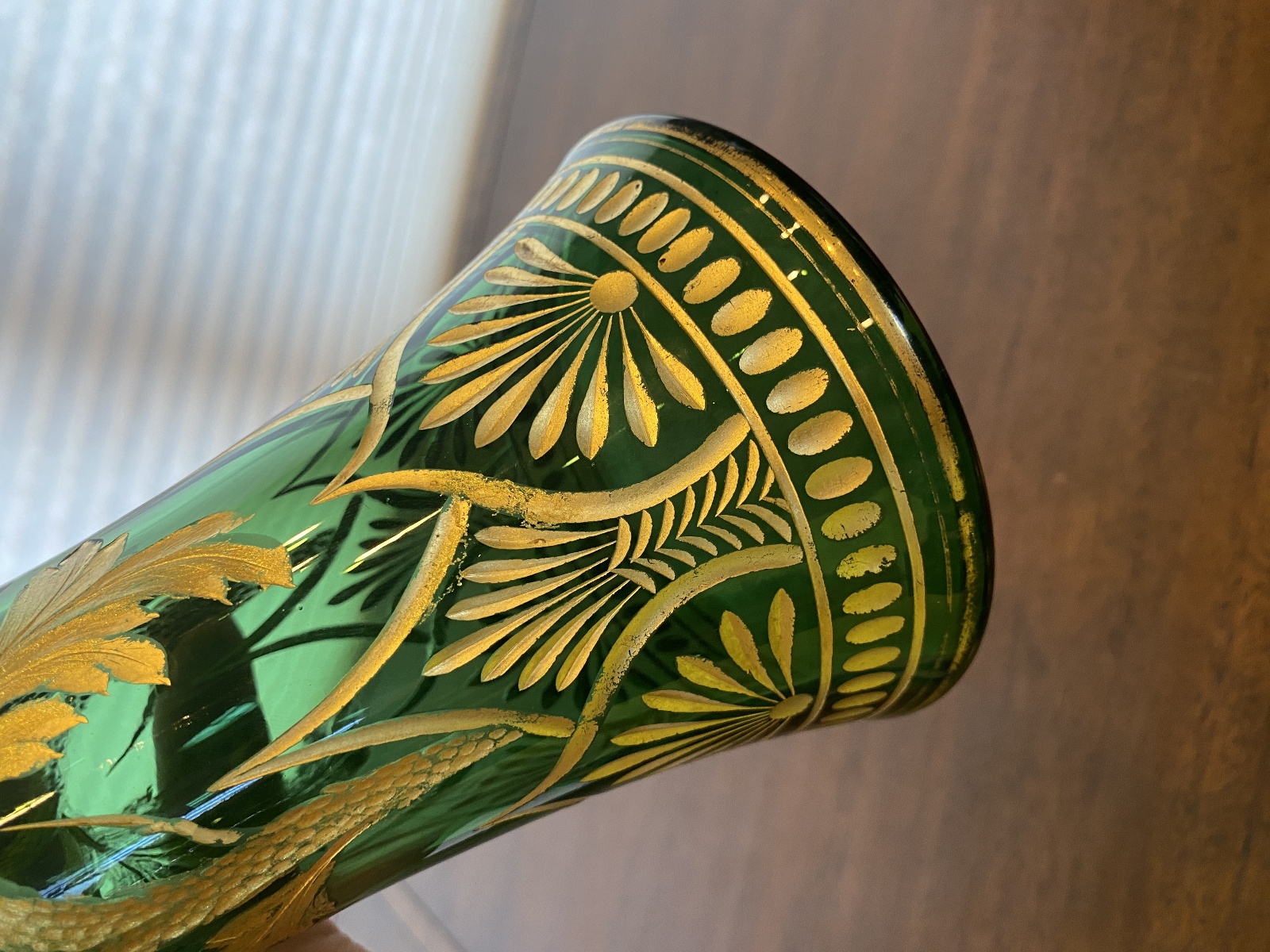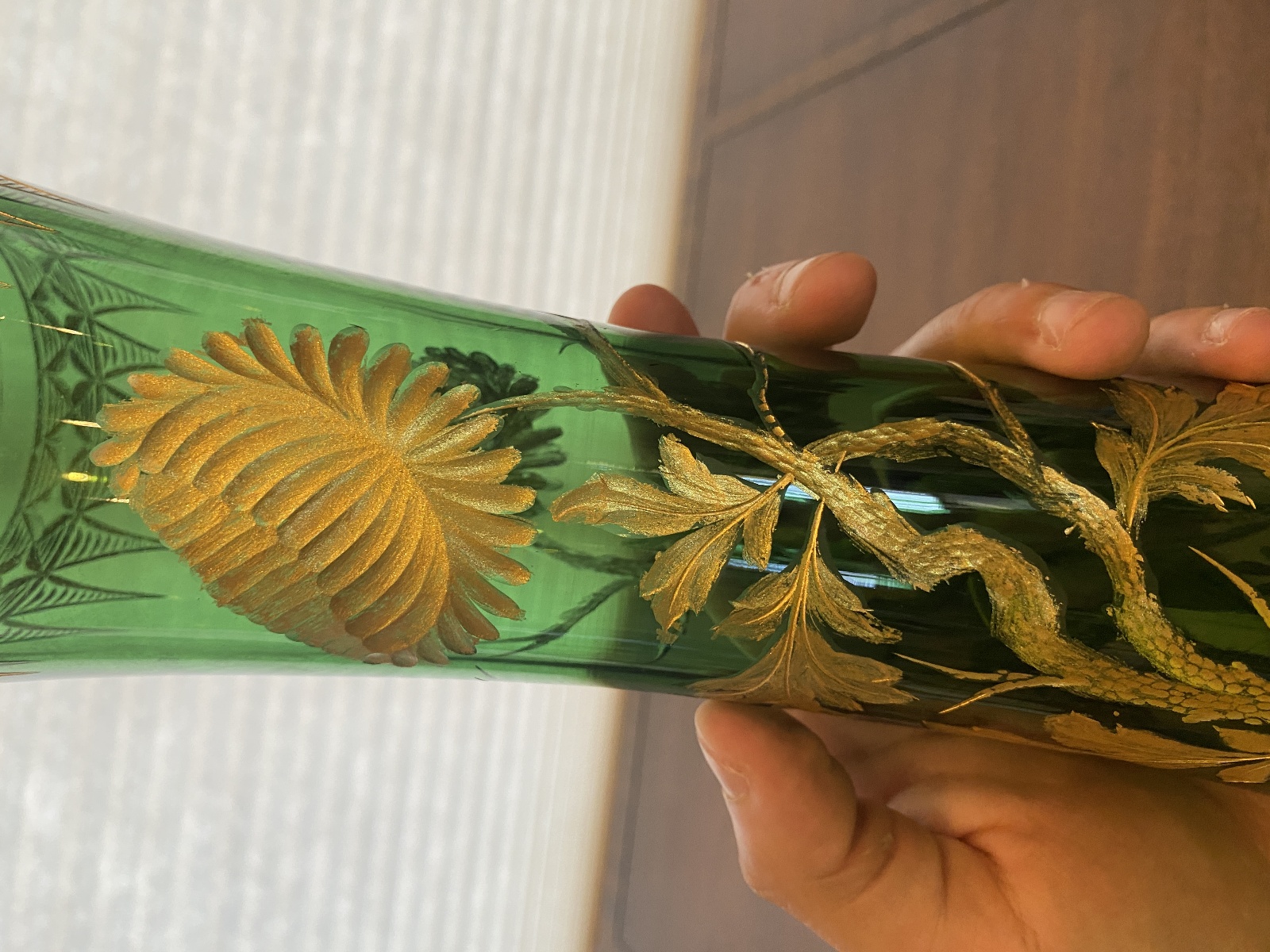 VTG ART NOUVEAU Green W/Gold Floral Etched Pattern Art Glass Vase 13.25"H