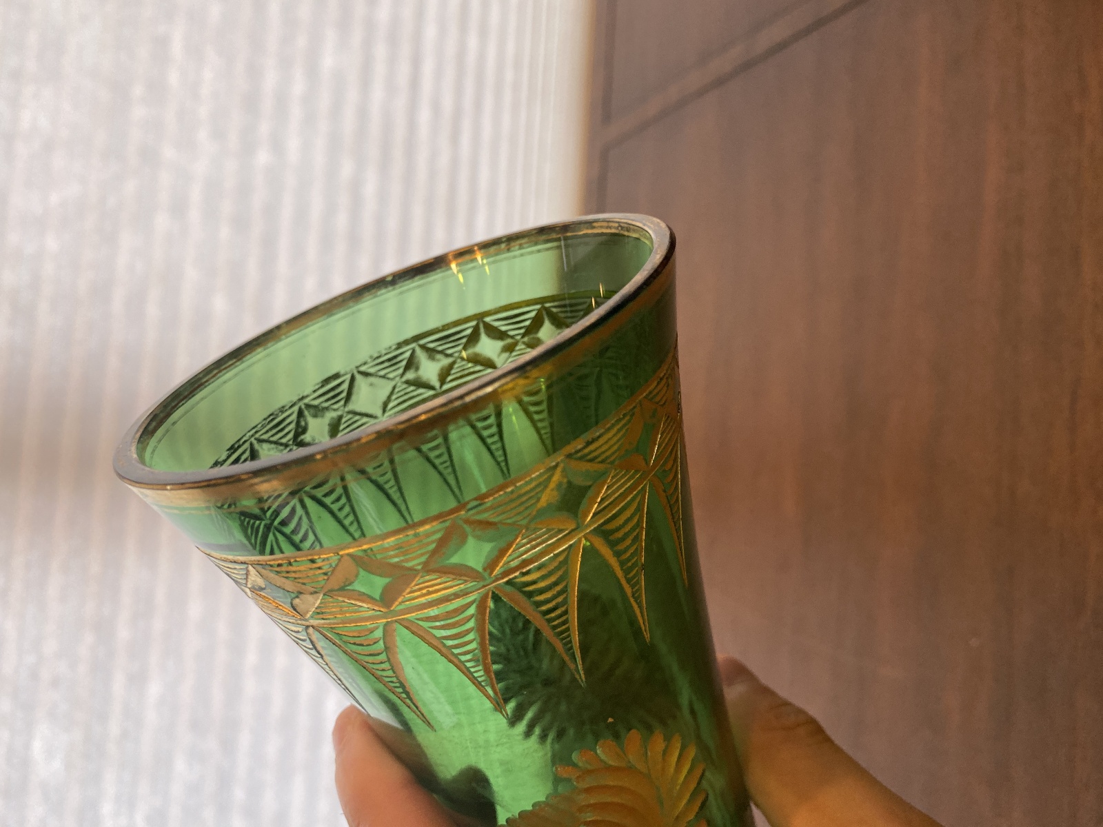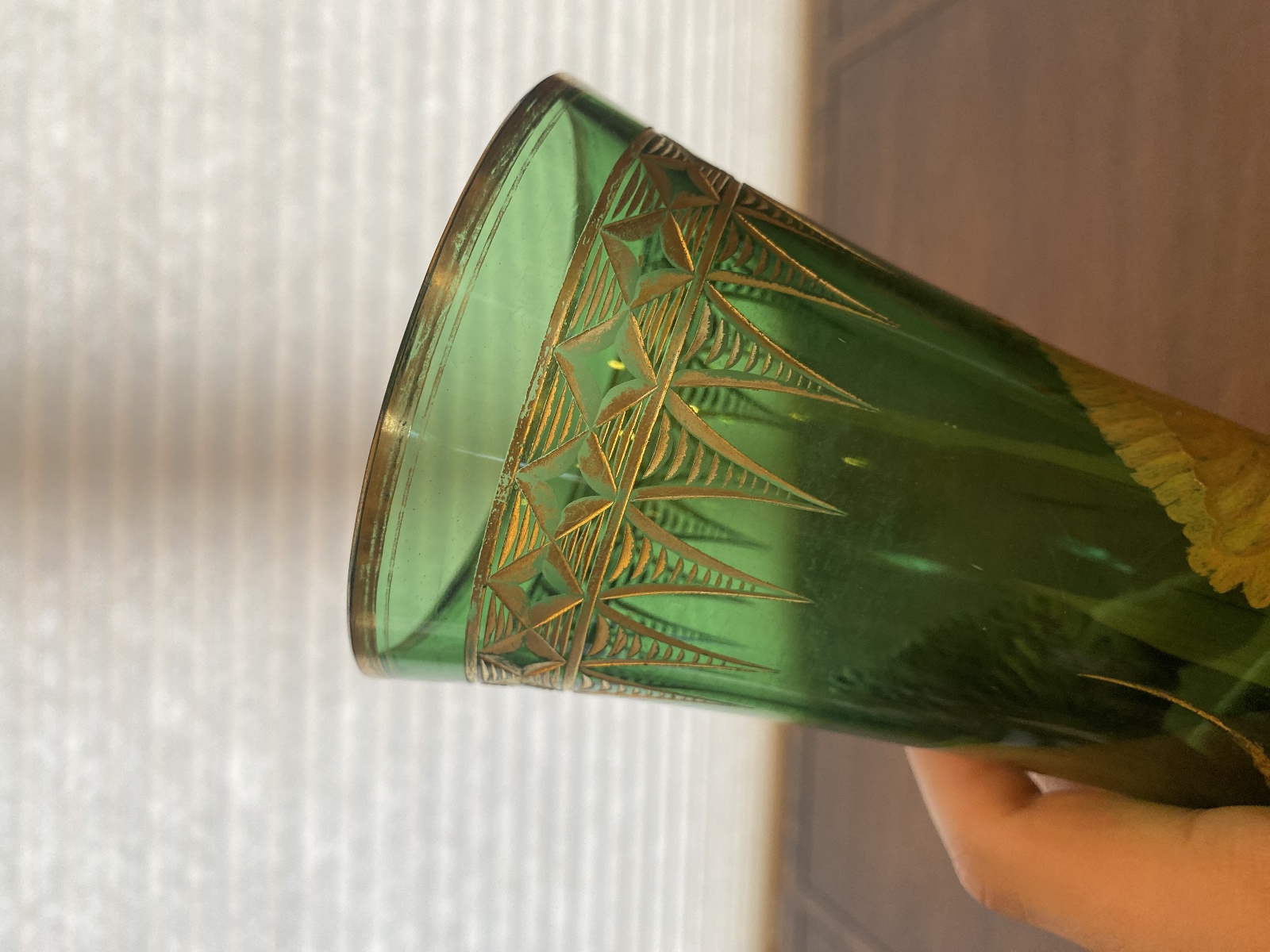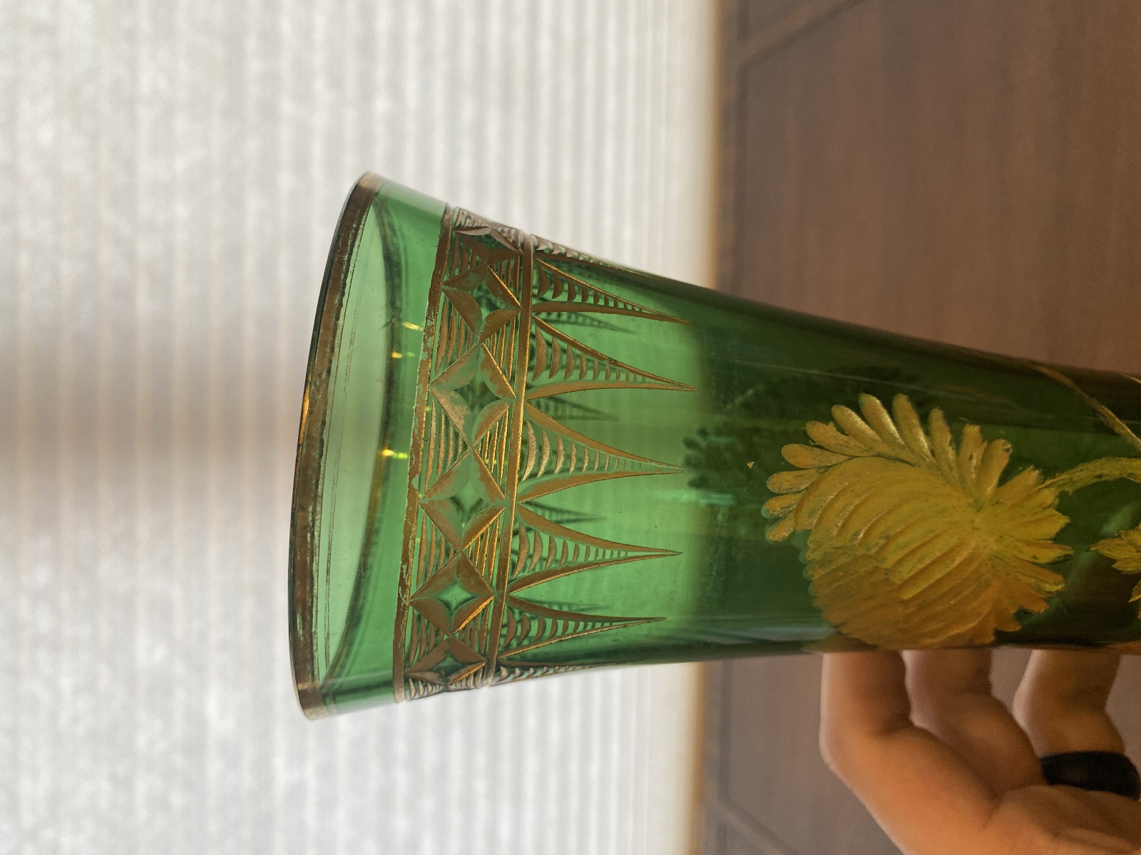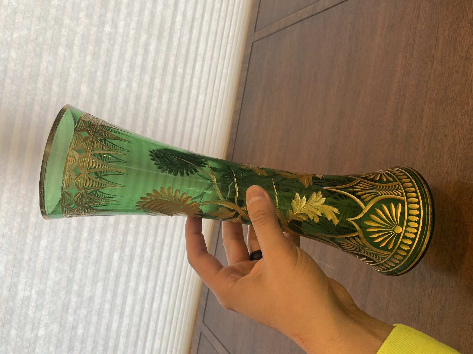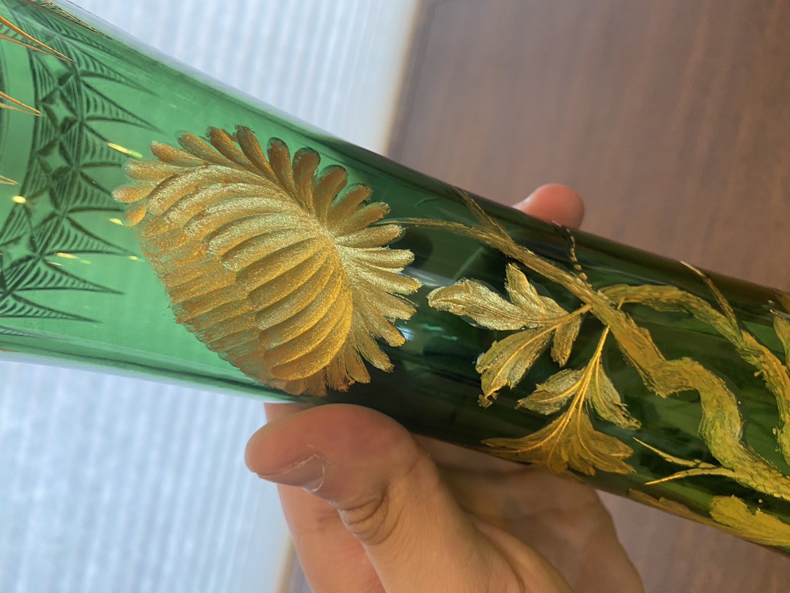 VTG ART NOUVEAU Green W/Gold Floral Etched Pattern Art Glass Vase 13.25"H