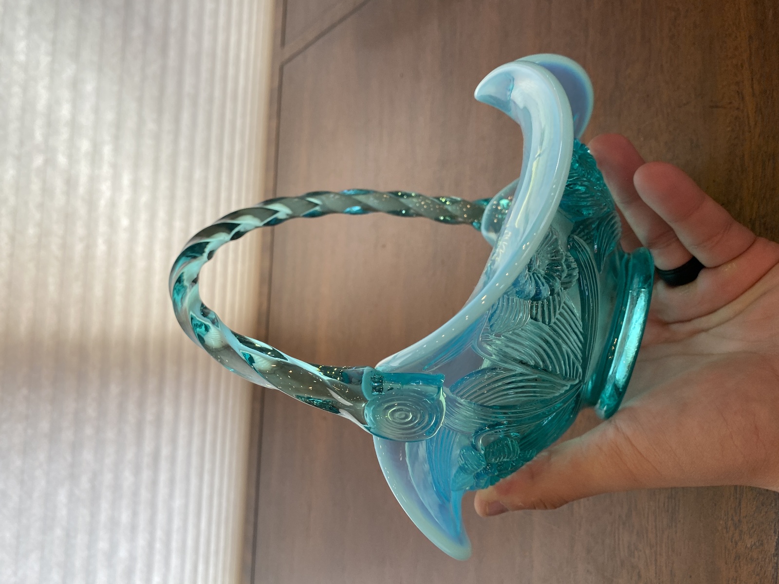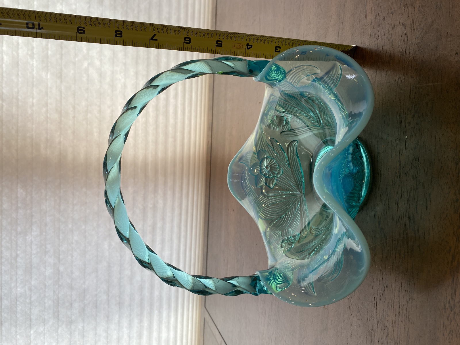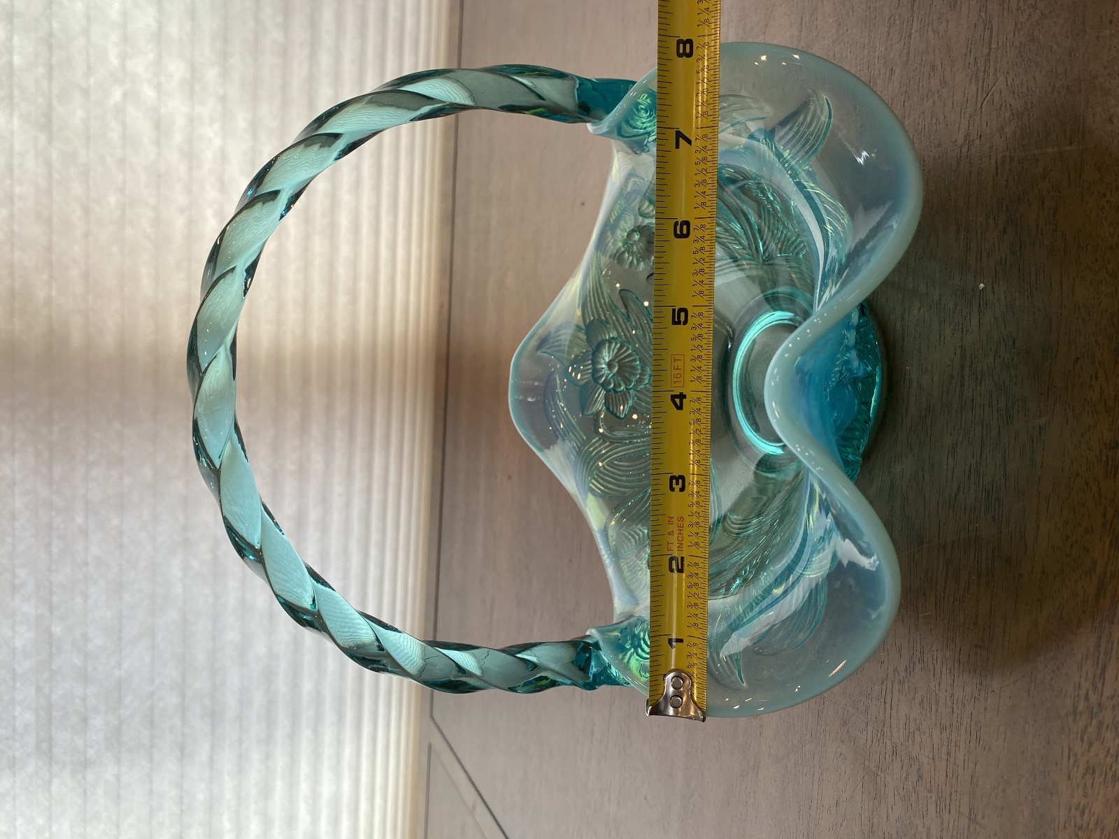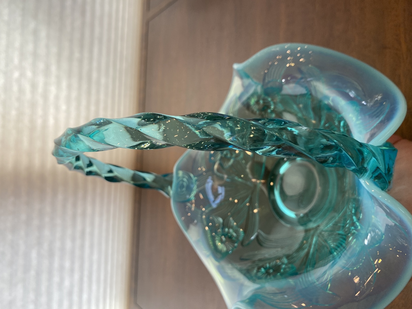 VTG FENTON Aqua Blue Opalescent Floral Pattern Glass Twisted Handle Basket 8"H