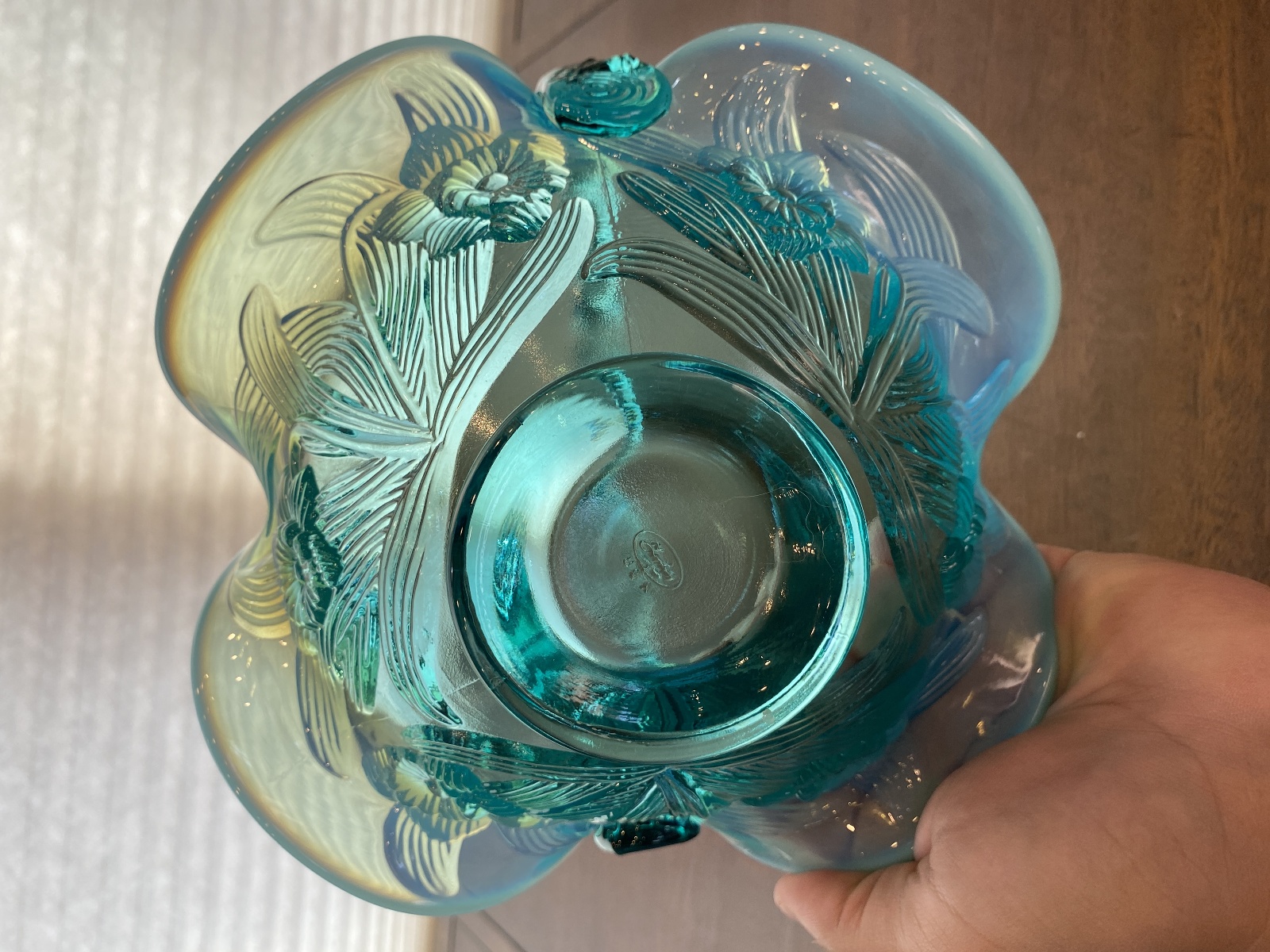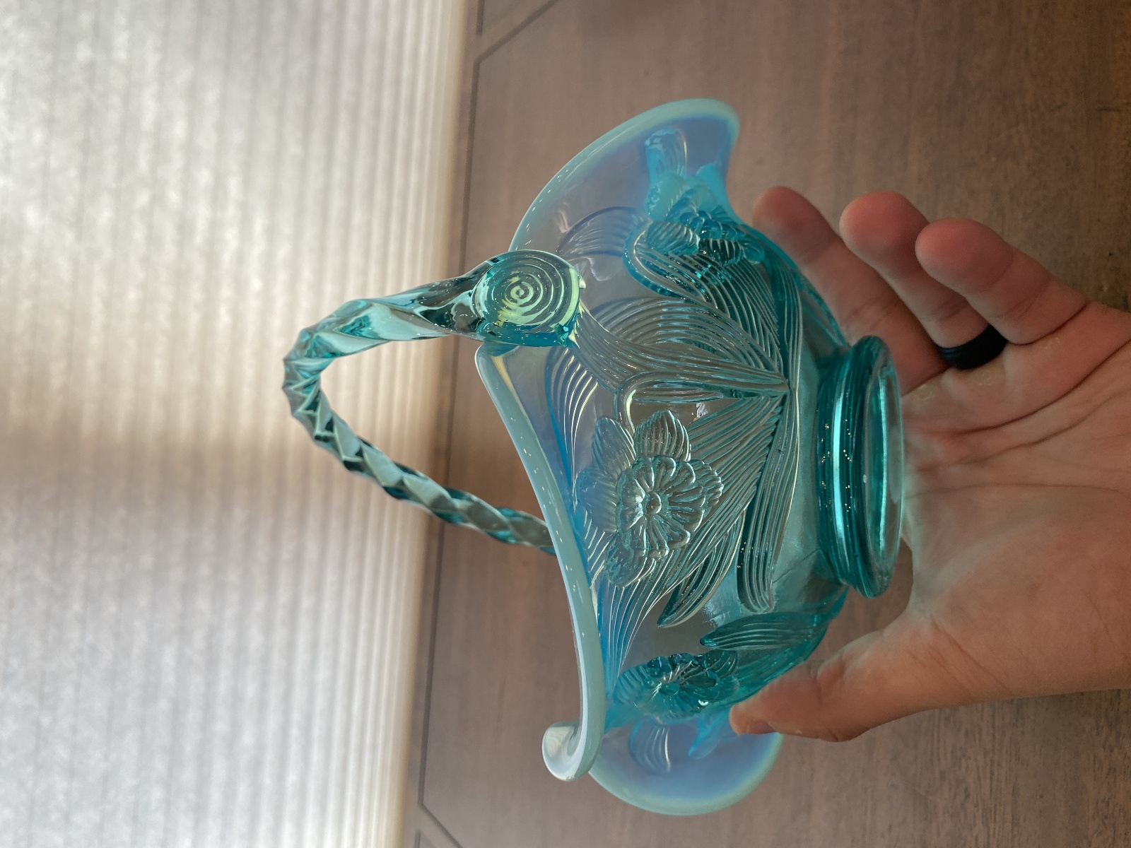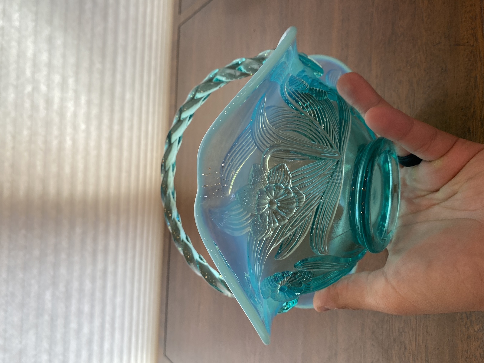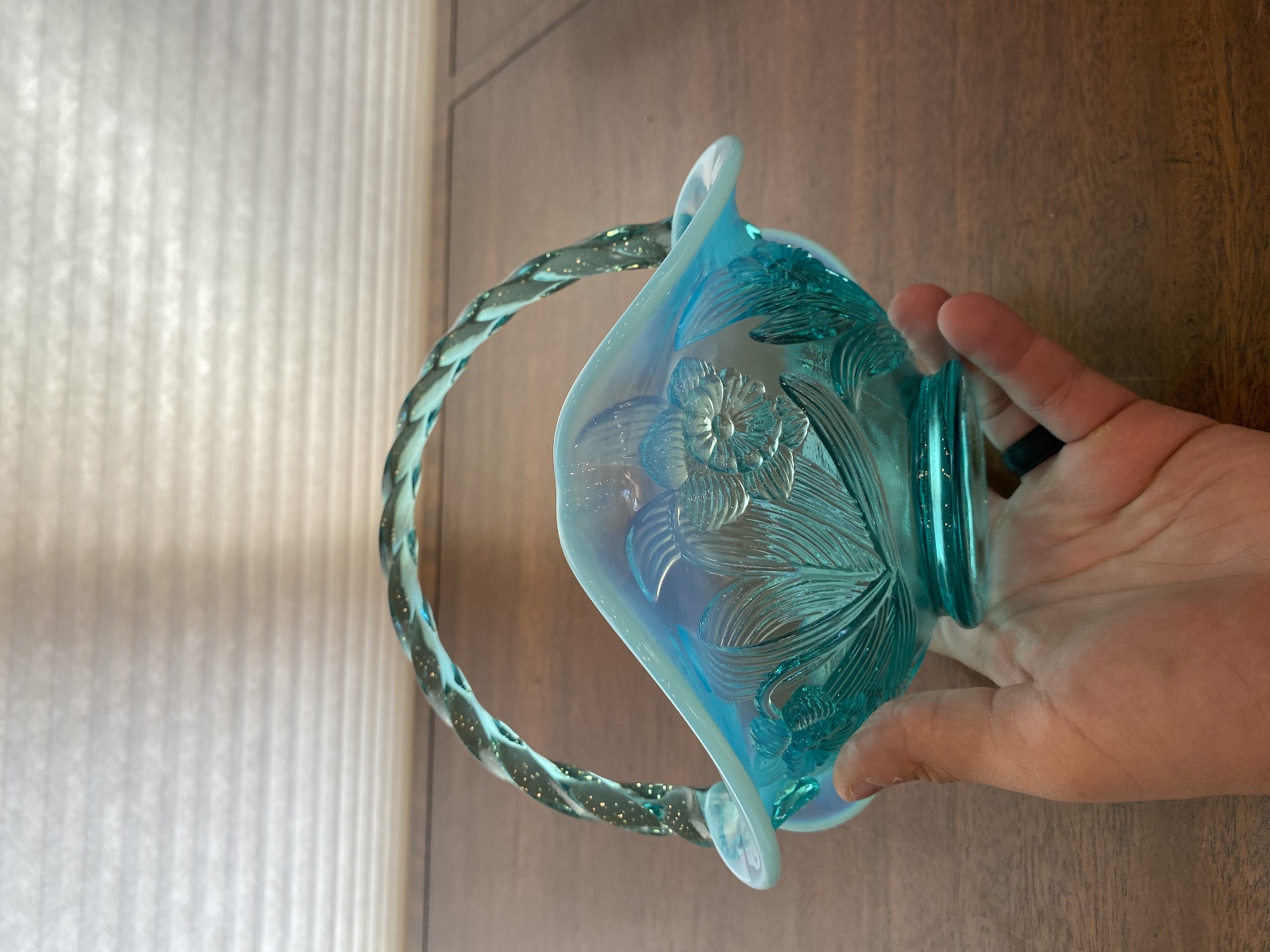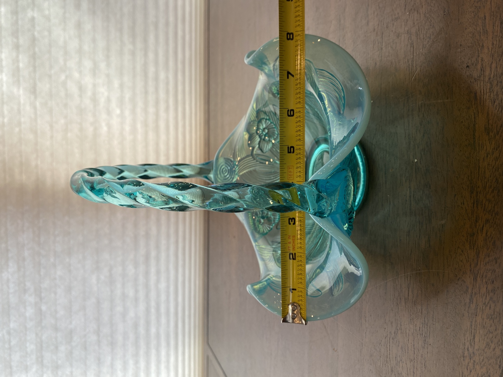 VTG FENTON Aqua Blue Opalescent Floral Pattern Glass Twisted Handle Basket 8"H