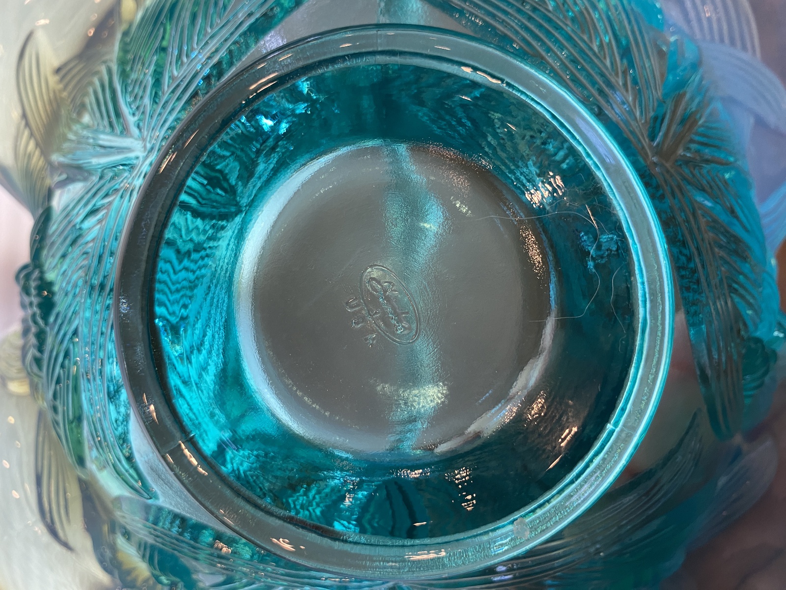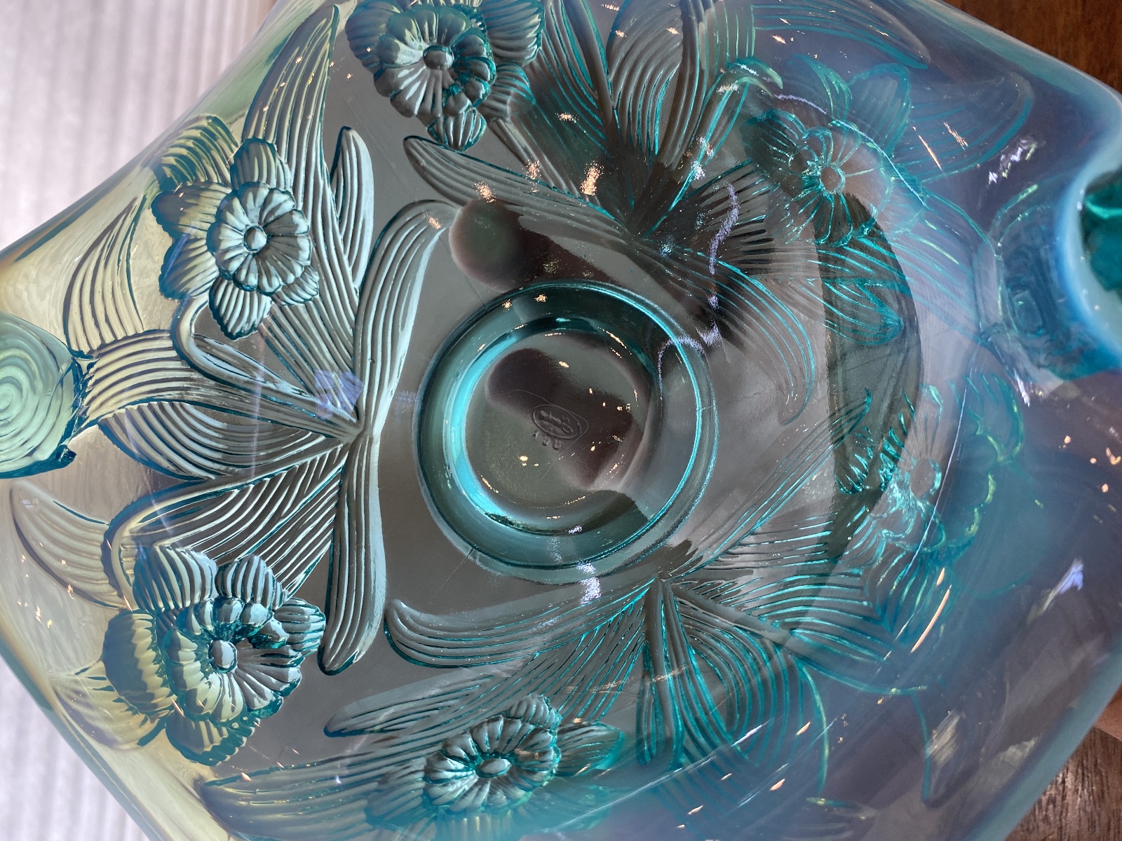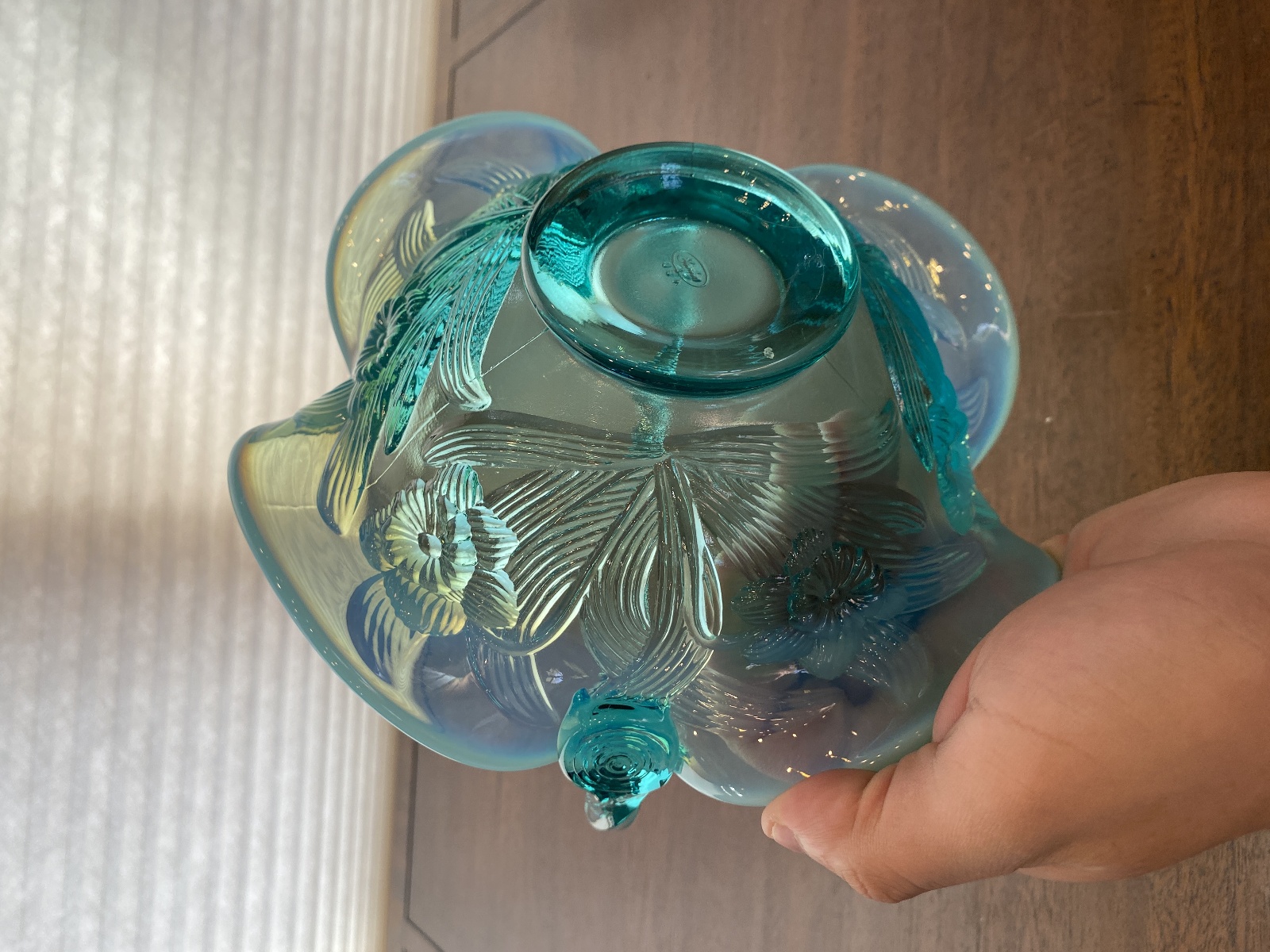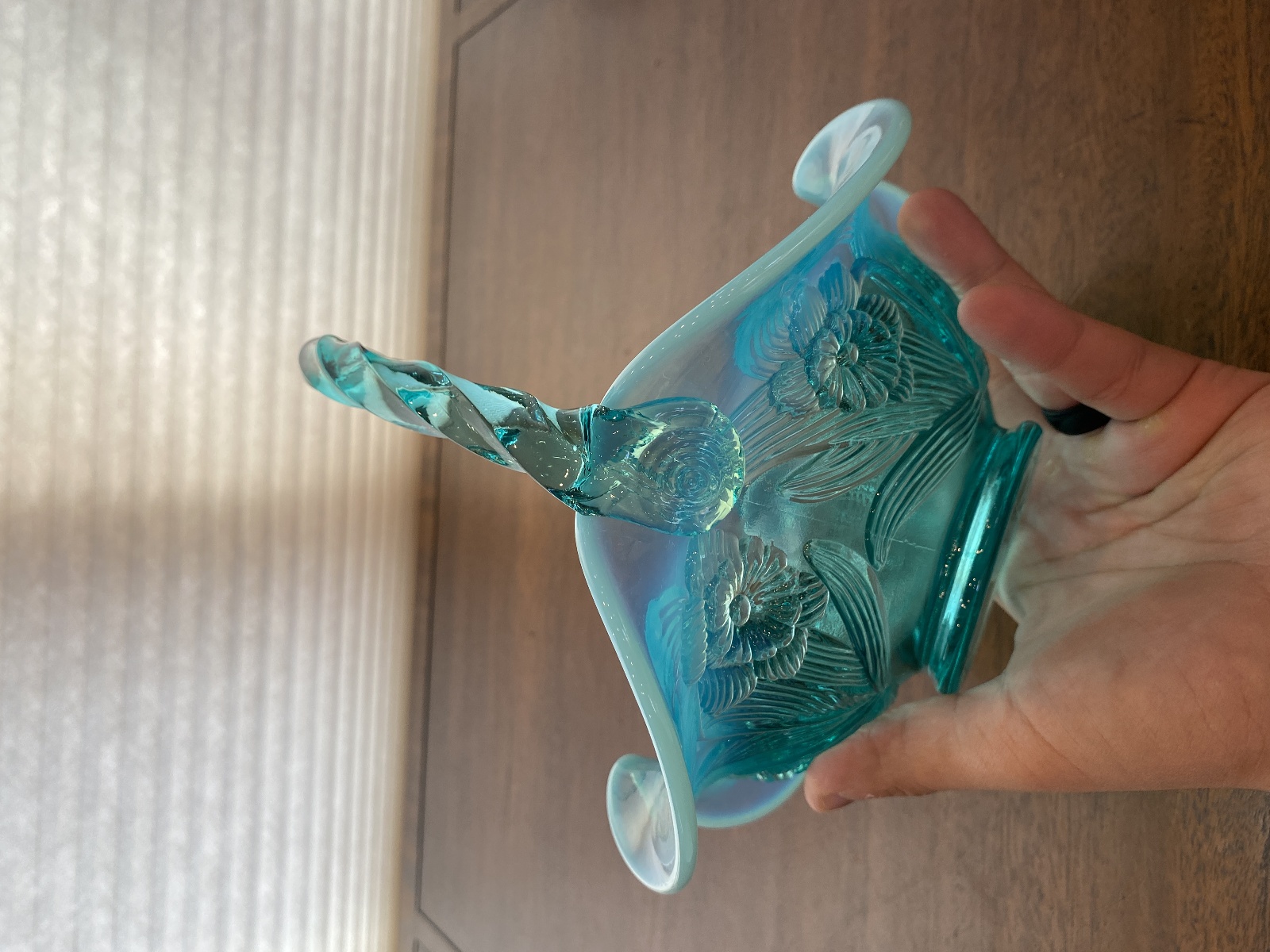 VTG FENTON Aqua Blue Opalescent Floral Pattern Glass Twisted Handle Basket 8"H