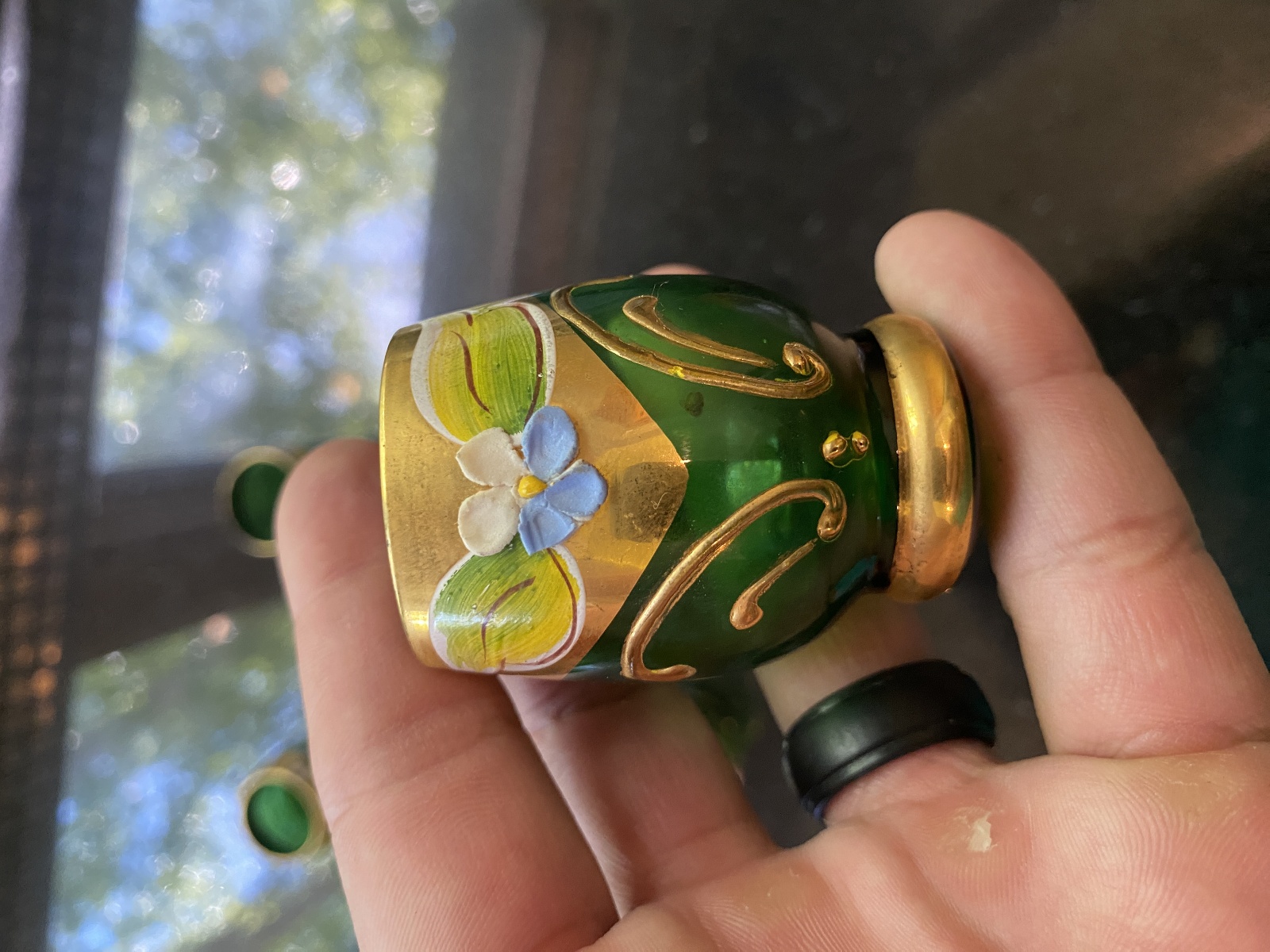 All pieces are in great condition (Slight wear from many years of love, some of the flowers have some chipping please lookout the photos). (Please refer back to the photos for condition and feel free to message me if you have any questions. Thank you)! Approximate measurements 3"W x 10"H(Decanter W/Stopper) 1.5"W x 2"H. 100% of the proceeds go to the registered non profit Cards of Love Inc. and with your purchase you are helping raise money to fund scholarships for at risk youth. Thank you!