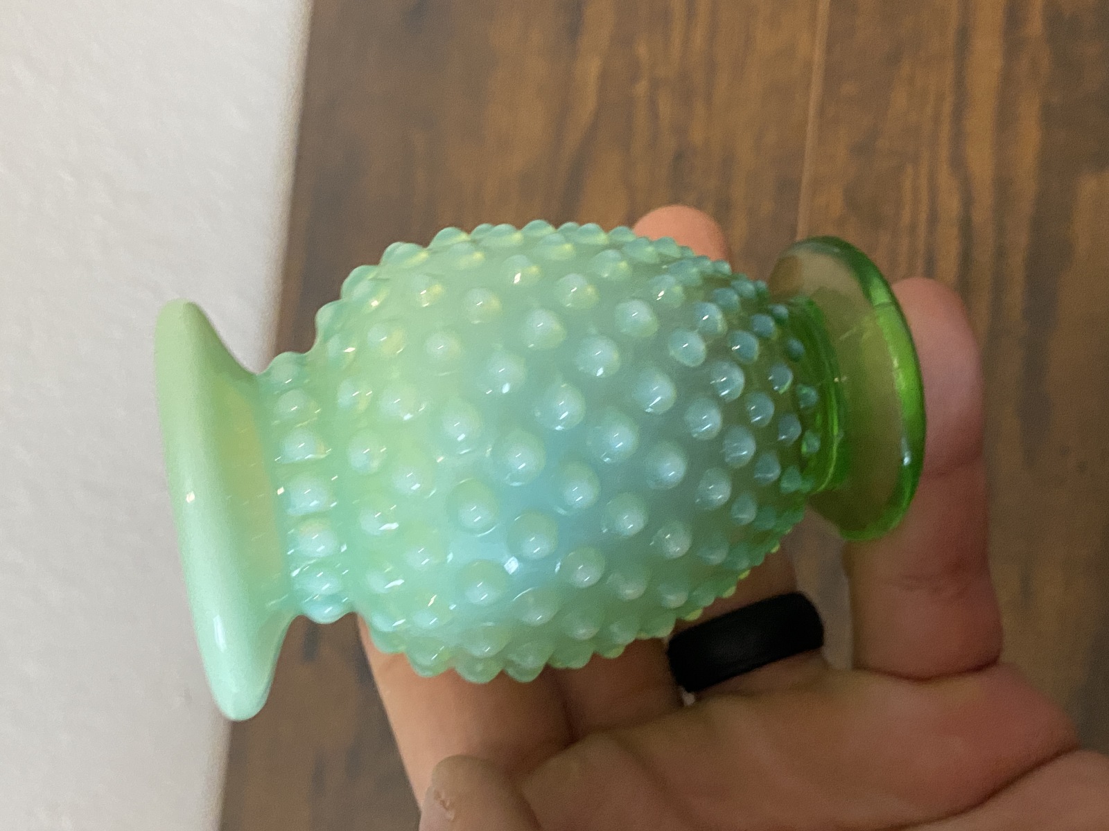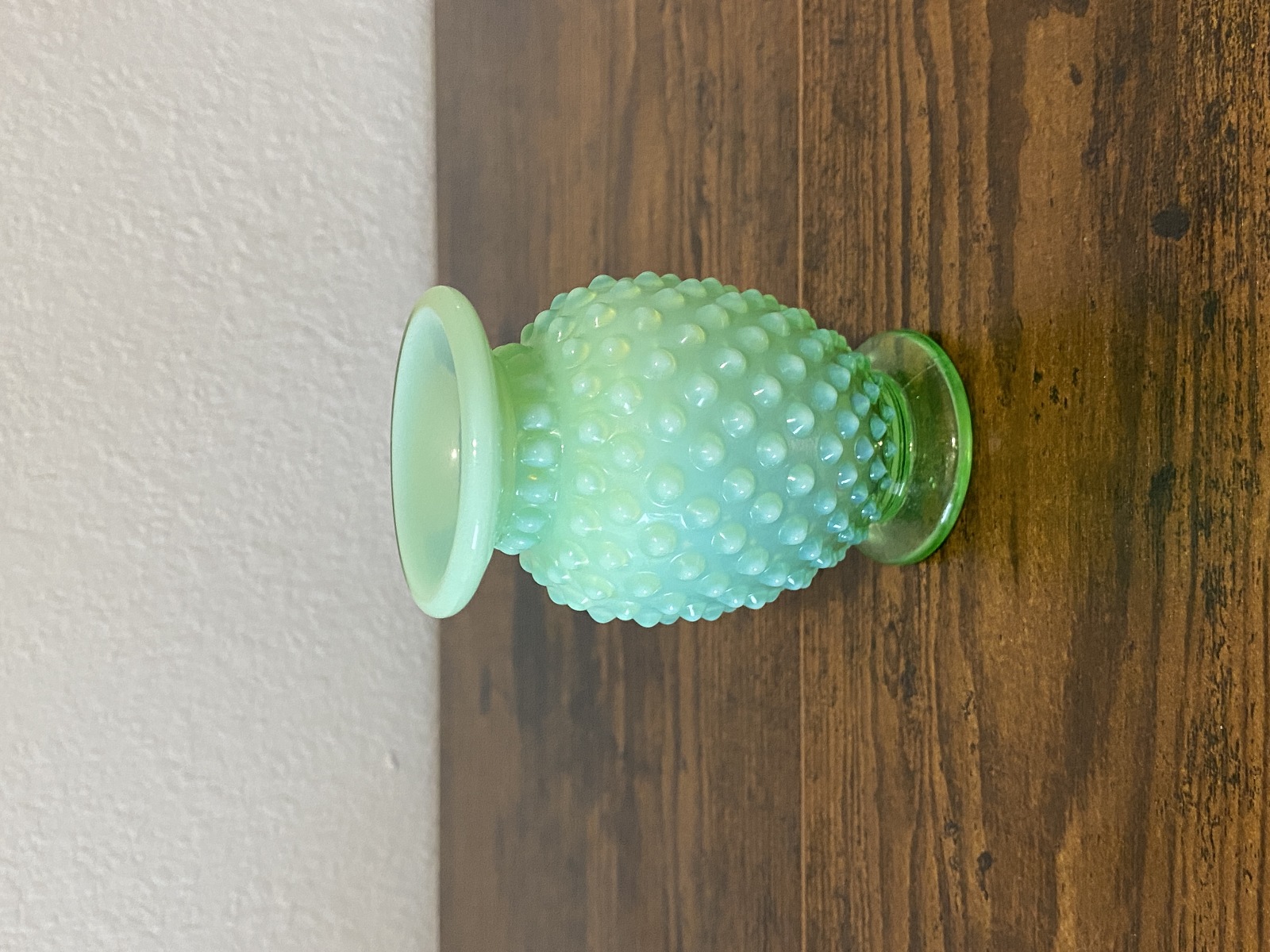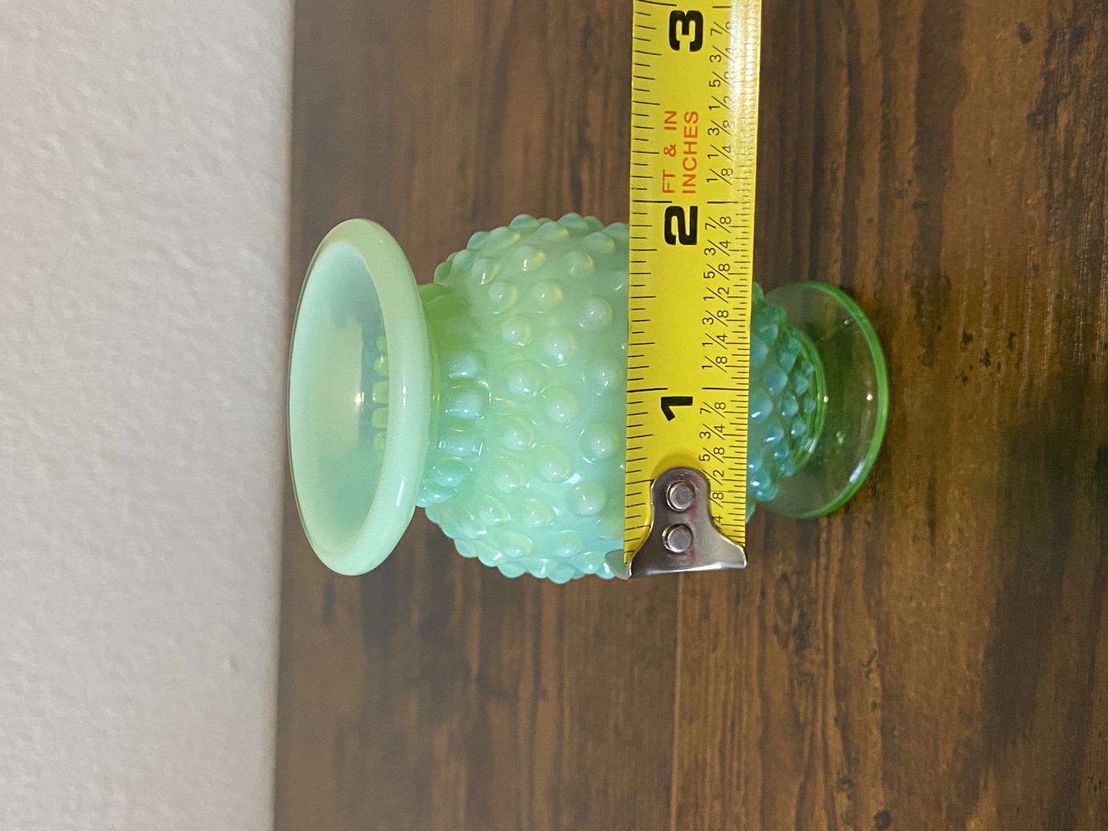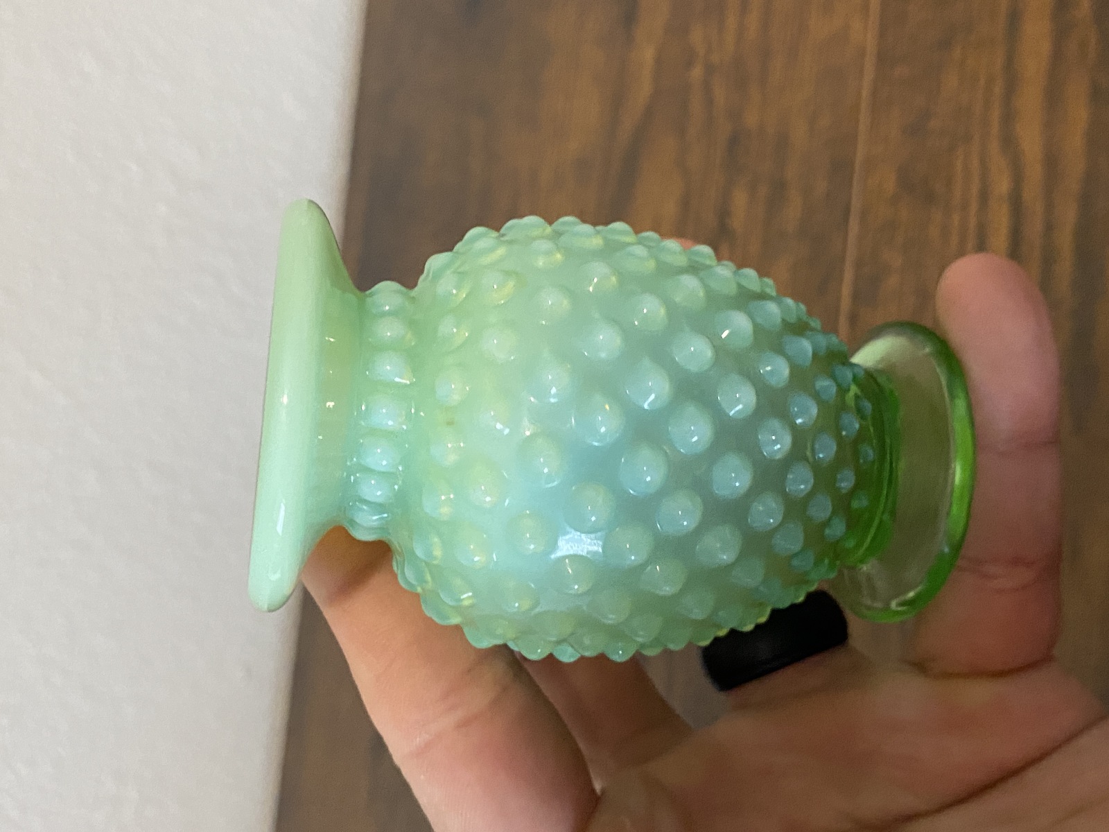 VTG Small UV REACTIVE FENTON Green Opalescent Hobnail Art Glass Vase 3.5"H