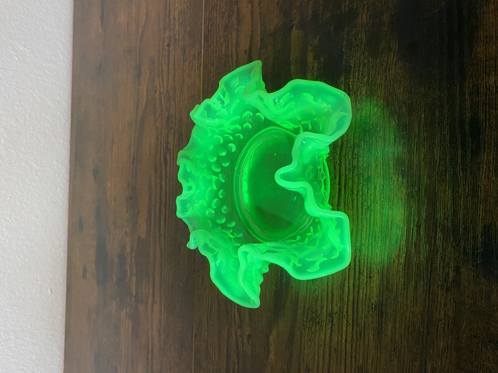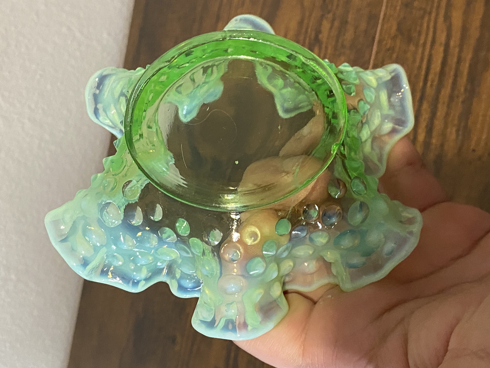 VTG UV REACTIVE FENTON Green Opalescent Hobnail Candy Dish 5.5"W