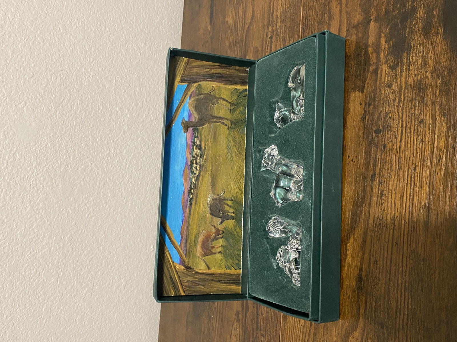 Approximate measurements 2.25"L x 1"W x 2"H(Camel) 2.25"L x .75"W x 2.5"H(Donkey), 2.5"L x 1"W x 1.75"H(Cow). 100% of the proceeds go to the registered non profit Cards of Love Inc. and with your purchase you are helping raise money to fund scholarships for at risk youth. Thank you!
